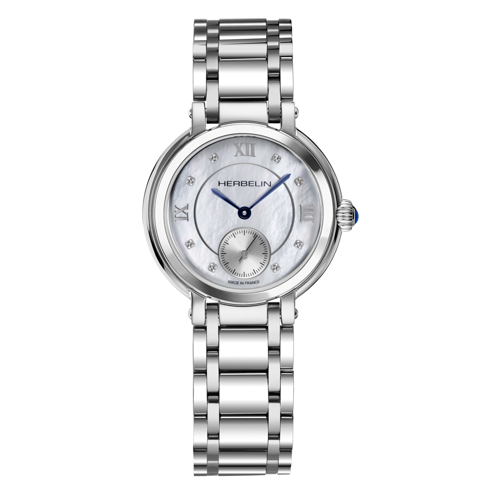 Galet Diamond is designed exclusively for ladies. The inspiration is from the curves of a pebble, which are natural and beautiful, combined with diamonds makes it a design that affords woman a choice of feminine, natural tone watch from HERBELIN. This natural curved case is offered in a 31.5mm diameter for a bolder look, featuring a soft link bracelet in clean Stainless steel. The Mother of Pearl target dial is finished with applied diamond indices including a small second hand subdial, protected by scratch resistant sapphire crystal. Powered by a Swiss quartz movement combining French design and Swiss accuracy.