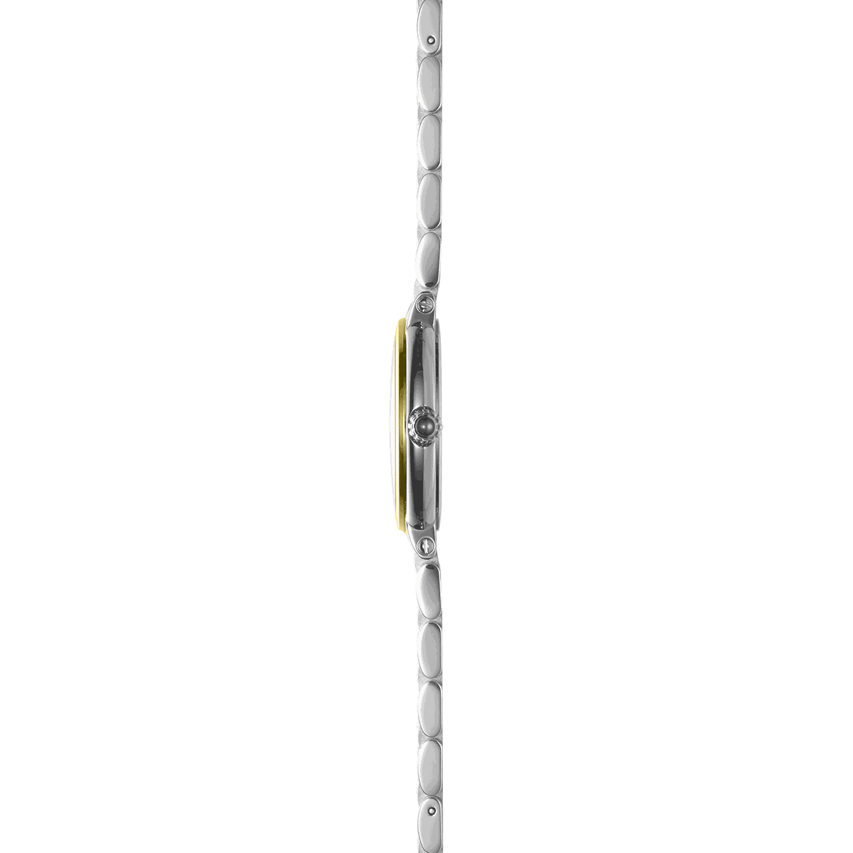 Galet Diamond is designed exclusively for ladies. The inspiration is from the curves of a pebble, which are natural and beautiful, combined with diamonds makes it a design that affords woman a choice of feminine, natural tone watch from HERBELIN. This natural curved case is offered in a 31.5mm diameter for a bolder look, featuring a soft link bracelet in clean Stainless steel with gold PVD plate. The Mother of Pearl target dial is finished with applied diamond indices including a small second hand subdial, protected by scratch resistant sapphire crystal. Powered by a Swiss quartz movement combining French design and Swiss accuracy.