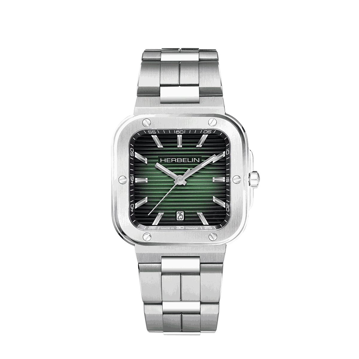 With its angular, square housing, the CAP CAMARAT presents itself for the first time in the retro style of the 70s. The three-hand watch from HERBELIN is the ideal timepiece for men who value expressive design as much as functionality and suitability for everyday use. The stainless steel watch with a matt look is as usual robust and sporty at the same time. The strong shade of green of the dial with the attractive French Navy pattern goes with any outfit and skilfully draws attention to itself. A Swiss quartz movement reliably ticks away inside this striking three-hand watch. The time is always easy to read thanks to the silver-colored indices equipped with luminous markers as well as the hour and minute hands and the date display at 6 o'clock. The high-quality double folding clasp on the metal strap closes securely and guarantees a high level of comfort. The water resistance of up to 100 metres rounds off the range of functions of the attractive timepiece. With its striking retro design, the novelty is the perfect accessory for any man who wants to make a statement.