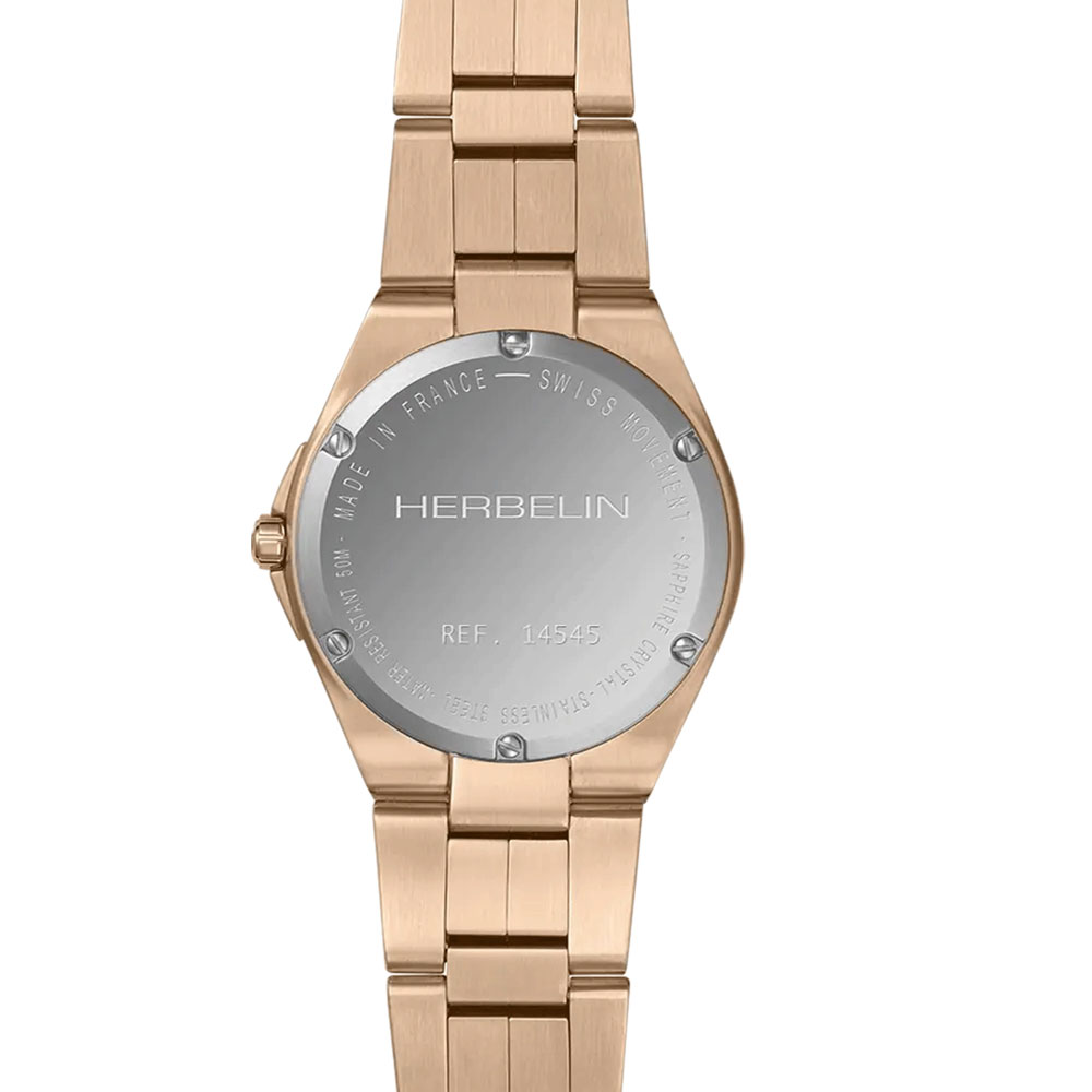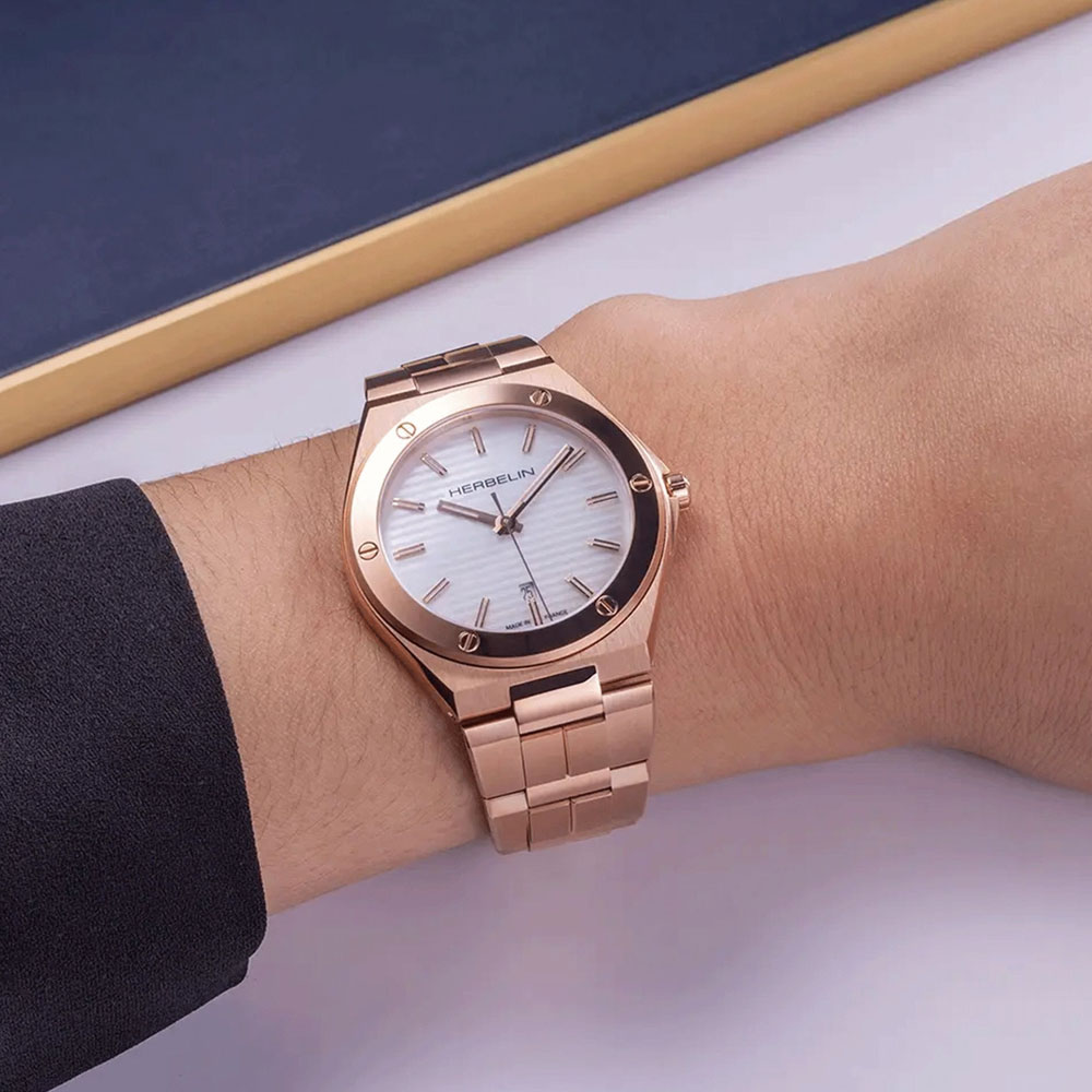 This HERBELIN Cap Camarat feminine design continues to hold the chic look with the sporty attributes . The hexagonal shape 33mm case in stainless steel with rose gold PVD is water resistant to 100m, designed with vertical brushed edges highlighted by polished facets. The horizontally engraved mother of pearl dial protected by sapphire crystal adds a touch of refinement and modernity to this model. The bracelet, integrated into the case, is inspired by the codes of the 70s. Its polished and brushed links are finished with a folding clasp for exceptional flexibility and comfort. This watch is the result of traditional French know-how that embodies the watchmaking heritage of the company.