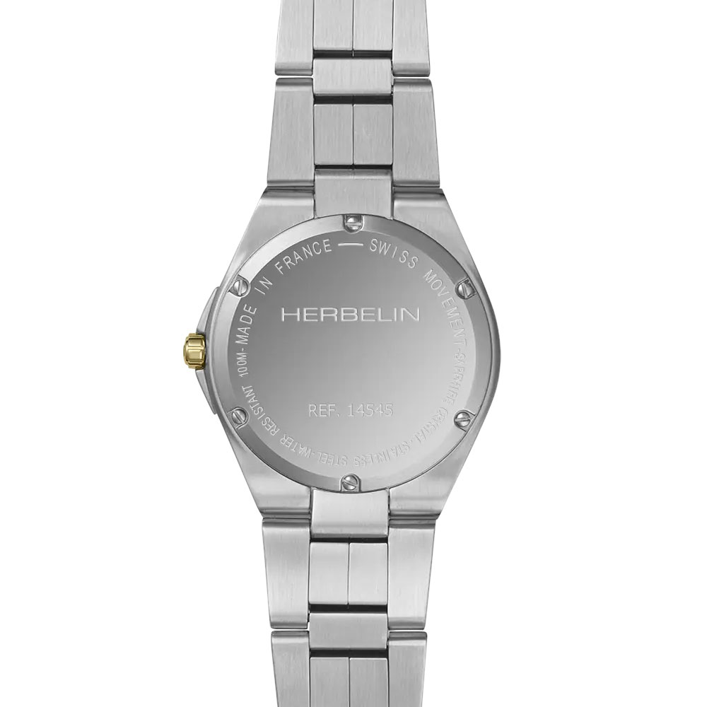This HERBELIN Cap Camarat feminine design continues to hold the chic look with the sporty attributes . The hexagonal shape 33mm case in stainless steel with rose gold PVD is water resistant to 100m, designed with vertical brushed edges highlighted by polished facets. The horizontally engraved mother of pearl dial protected by sapphire crystal adds a touch of refinement and modernity to this model. The bracelet, integrated into the case, is inspired by the codes of the 70s. Its polished and brushed links are finished with a folding clasp for exceptional flexibility and comfort. This watch is the result of traditional French know-how that embodies the watchmaking heritage of the company.