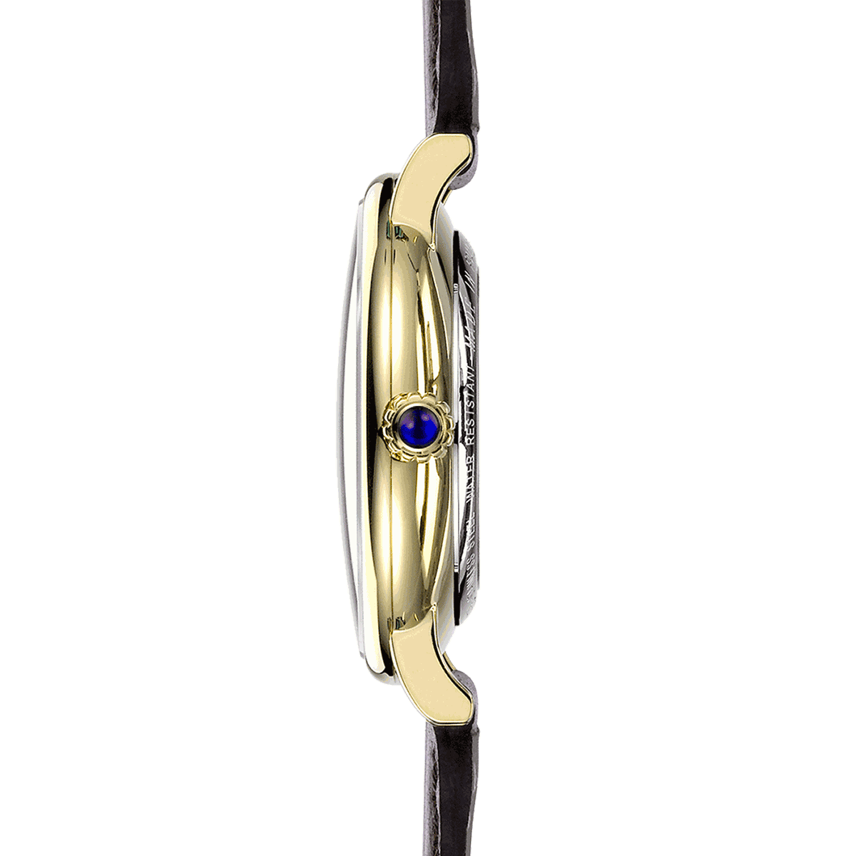 The HERBELIN Inspiration 1947 timepiece draws on the legendary first watches created by Michel Herbelin in the 1950's. This Inspiration is fitted with a Swiss automatic wound mechanical movement, whose workings can be admired through its transparent caseback. Its softly rounded 40 mm diameter case provides a distinctly vintage feel. The silver/white dial decorated with a brushed sunray pattern that reveals multiple nuances in the light. Complemented with a discreet date aperture at 6 o'clock, the ensemble plainly marks the passage of time. This piece is finished with a ribbed, ball-shaped crown set with a blue cabochon, and paired with a brown pattern leather. A gem of watchmaking art, it was designed and assembled in France at the Michel Herbelin studios.