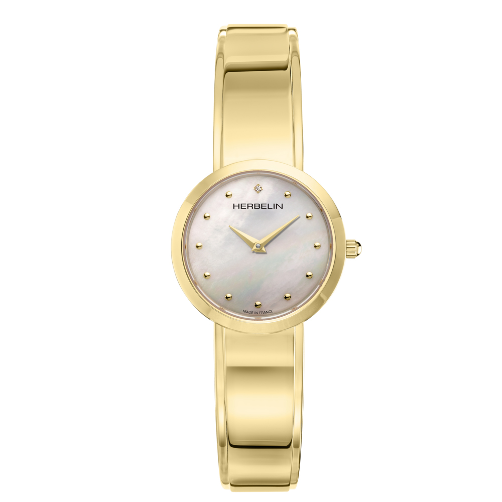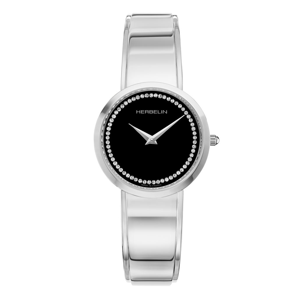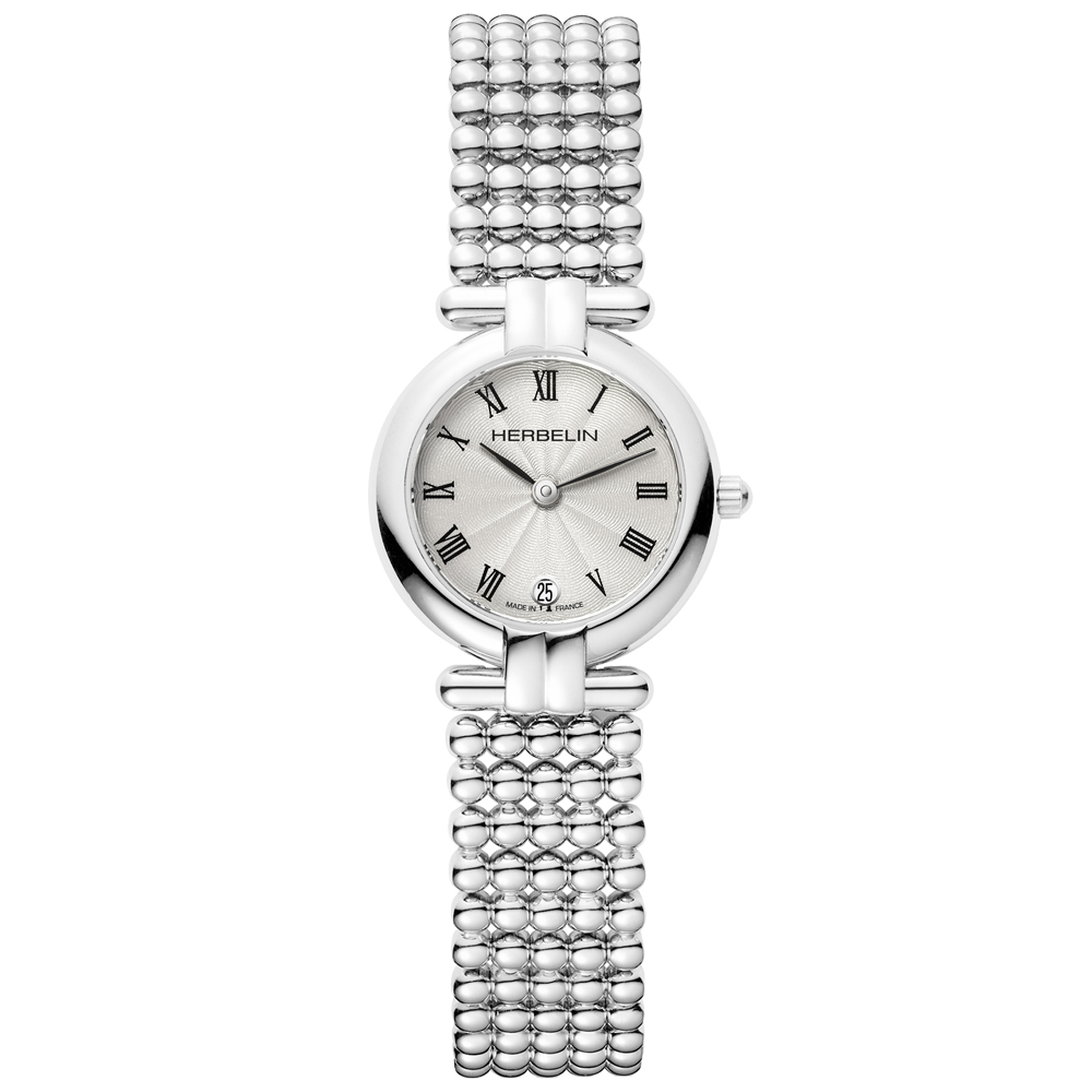 Perles timepiece is a unique design from the French watchmaking brand HERBELIN. The bracelet, which is made up of rows of five beads or perles is so pleasing to the touch and moulds elegantly to the wrist. The dial is in an ivory white turned finish with black roman numerals. Both the case and bracelet are made from 316L grade stainless steel. A design that celebrates feminine sophistication, which is the very symbol of French chic.