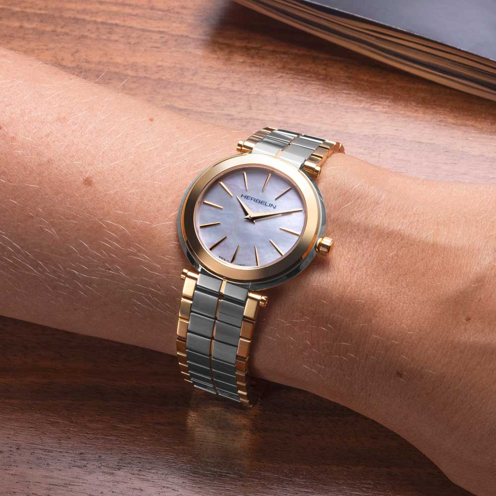 Emblematic of the French brand, NEWPORT SLIM proudly displays a streamlined silhouette, with a thickness of 5.85mm, a first for the Newport Collection. The stainless steel case retains the Newport traditional central horns and crown engraved with a ship's wheel. Divided into three intricately carved facets, its polished finish sculpts the light.The mother of pearl dial is punctuated with gold indices, giving an elegant look to a sports style. This Newport Slim ladies is designed, assembled, adjusted and inspected at the Michel Herbelin workshop in France.