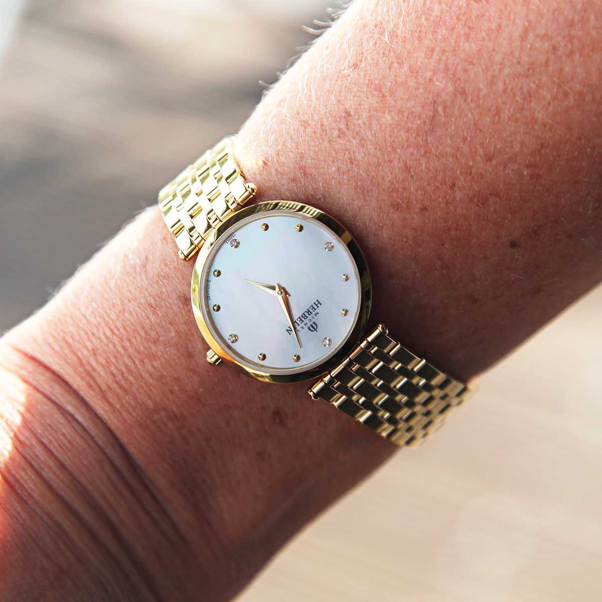 This Diamond Epsilon style from Herbelin is for the woman who wants understated, clean lines and unsurpassed craftsmanship. Powered by a Swiss quartz two hand analogue, the 316L stainless steel case is a slim 4mm and 28mm in diameter, encasing a flat scratch resistant sapphire crystal glass. The polished two tone stainless steel and yellow gold PVD link bracelet is finished to the highest standards feeling fluid and tactile. The clasp is a top quality folding clasp with side release buttons to ensure the security of the watch. The soft white mother of pearl dial is enhanced with twelve diamond hour markers , creating a classic for a lifetime.