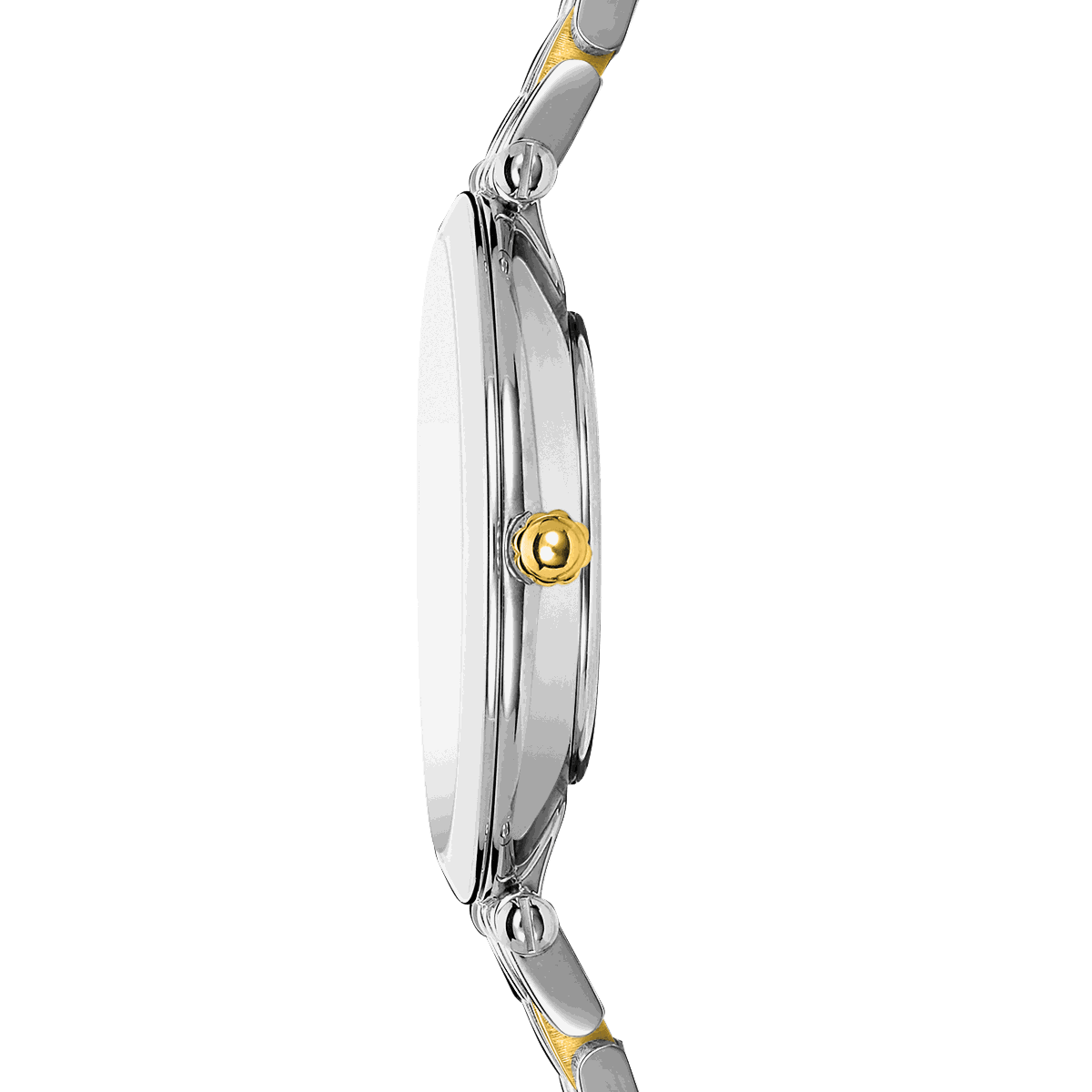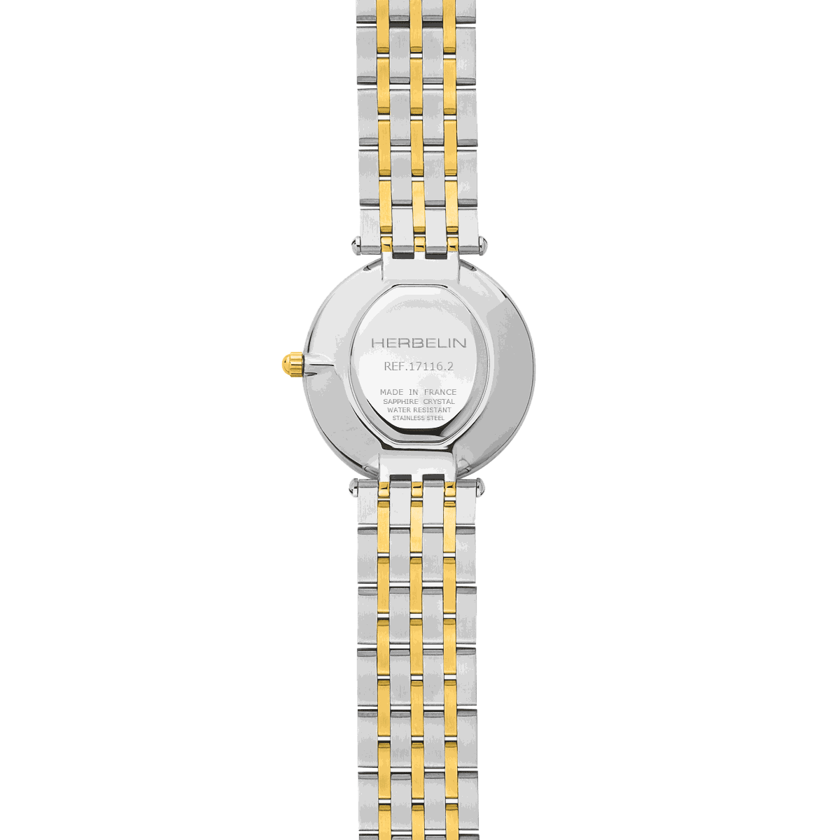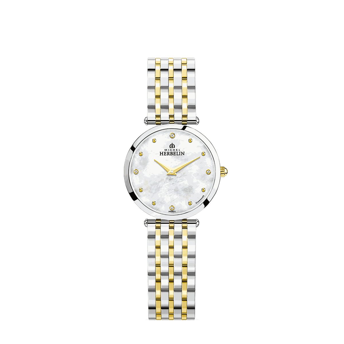 This Diamond Epsilon style from Herbelin is for the woman who wants understated, clean lines and unsurpassed craftsmanship. Powered by a Swiss quartz two hand analogue, the 316L stainless steel case is a slim 4mm and 28mm in diameter, encasing a flat scratch resistant sapphire crystal glass. The polished two tone stainless steel and yellow gold PVD link bracelet is finished to the highest standards feeling fluid and tactile. The clasp is a top quality folding clasp with side release buttons to ensure the security of the watch. The soft white mother of pearl dial is enhanced with twelve diamond hour markers , creating a classic for a lifetime.