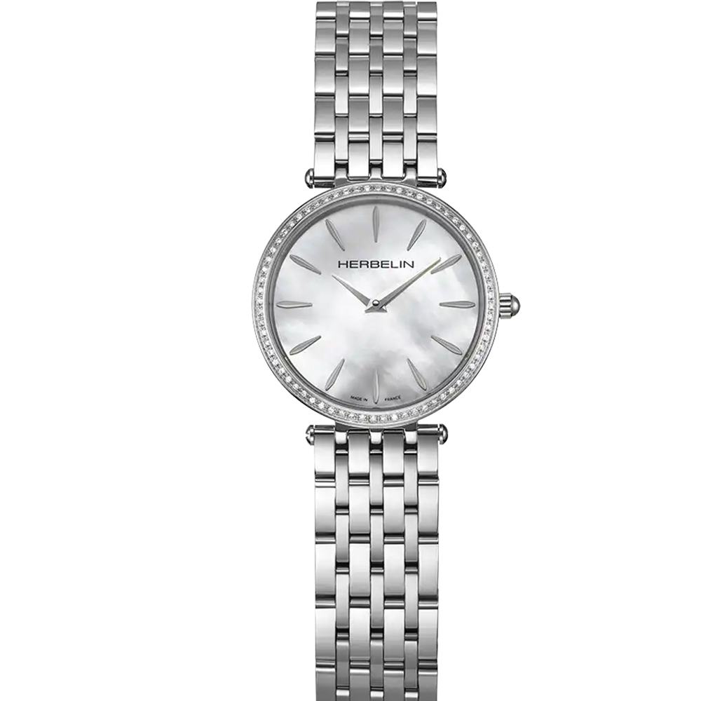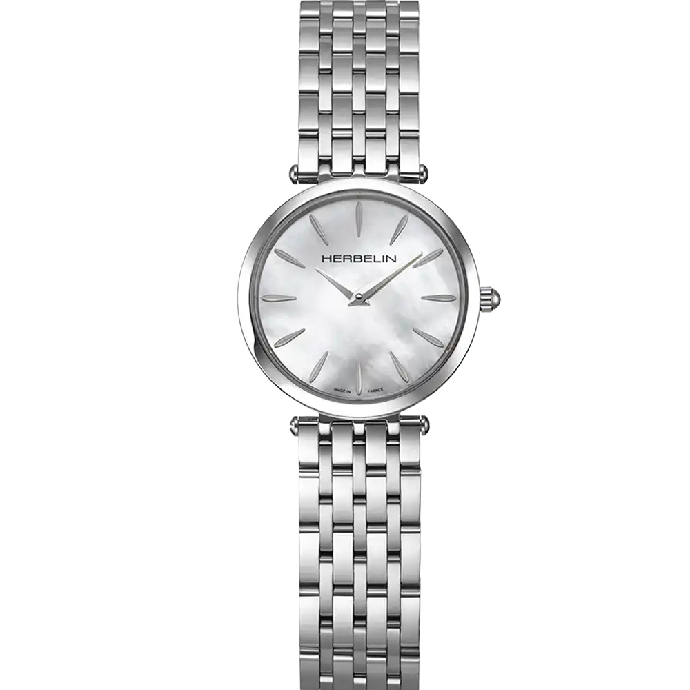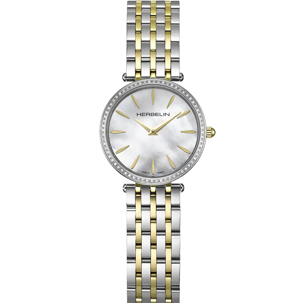 Elegant and delicately luminous, the Epsilon Quartz Mother-of-Pearl & Steel / Gold PVD watch embodies a refined interpretation of feminine watchmaking according to HERBELIN. Its round 316 L stainless steel case, enhanced by touches of yellow gold PVD, offers a harmonious contrast between modernity and warmth, perfectly balanced by a diameter of 28 mm and remarkable finesse. The real white mother-of-pearl dial reveals unique iridescent reflections, bringing softness and depth to the whole. The golden indexes and hands elegantly underline the purity of the dial, ensuring clear reading of the hours and minutes, protected by a resistant sapphire crystal. Powered by a Swiss Ronda quartz movement recognized for its precision and reliability, this Epsilon accompanies everyday life with serenity. Waterproof up to 30 meters, it meets the requirements of urban use while remaining very light on the wrist. Its two-tone bracelet in stainless steel and yellow gold PVD, equipped with a folding clasp, extends the elegance of the case and ensures optimal comfort. Designed for women looking for a refined, luminous and timeless timepiece, theEpsilon Quartz Mother of Pearl & Steel / Gold PVD perfectly illustrates French watchmaking know-how, between finesse, femininity and precision.