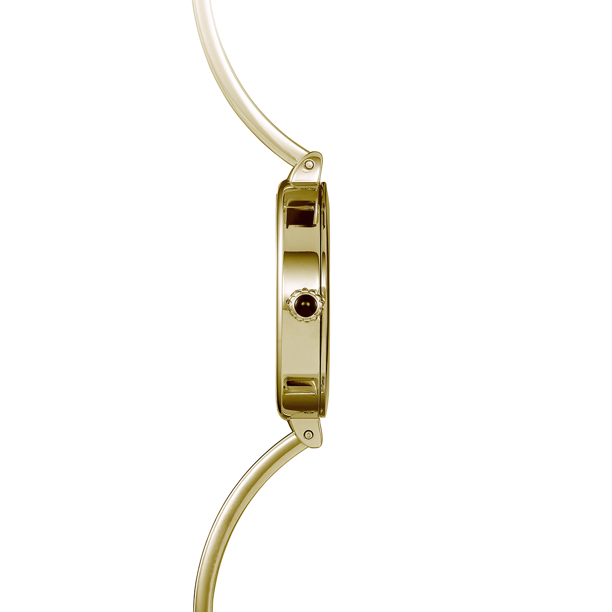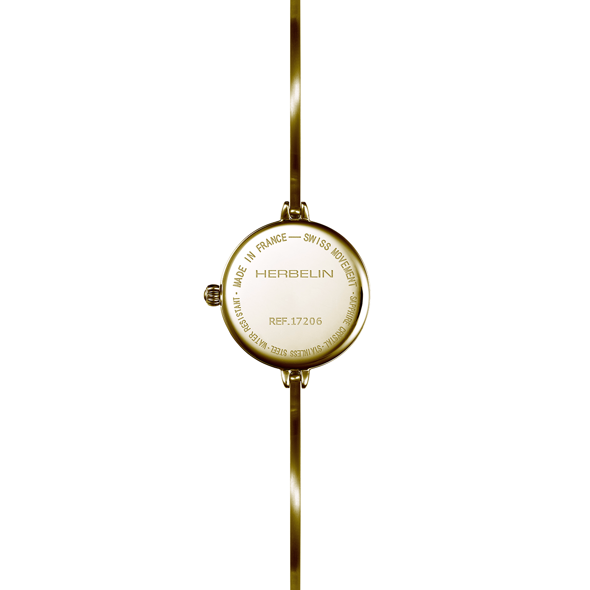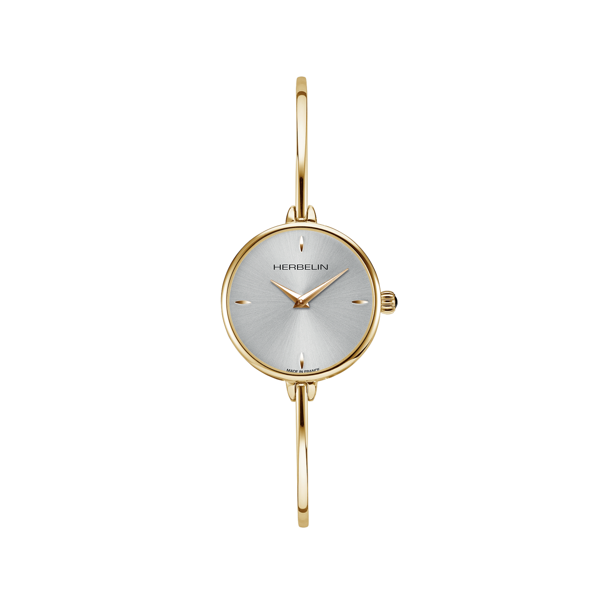 The HERBELIN Fil collection is designed with the attention to the smallest detail . Fil accompanies women who love subtly offbeat chique. The rigidity of the stainless steel bracelet with gold PVD plate, coupled with the 26mm case accentuates a finesse that is refined and delicate. The clasp is a fold over link clasp that compliments the jewellery feel. The silver white dial with gold indices applied every quarter is protected by sapphire crystal, has an understated elegance. A true design that is inspired by the past, however adapted to current design technologies.