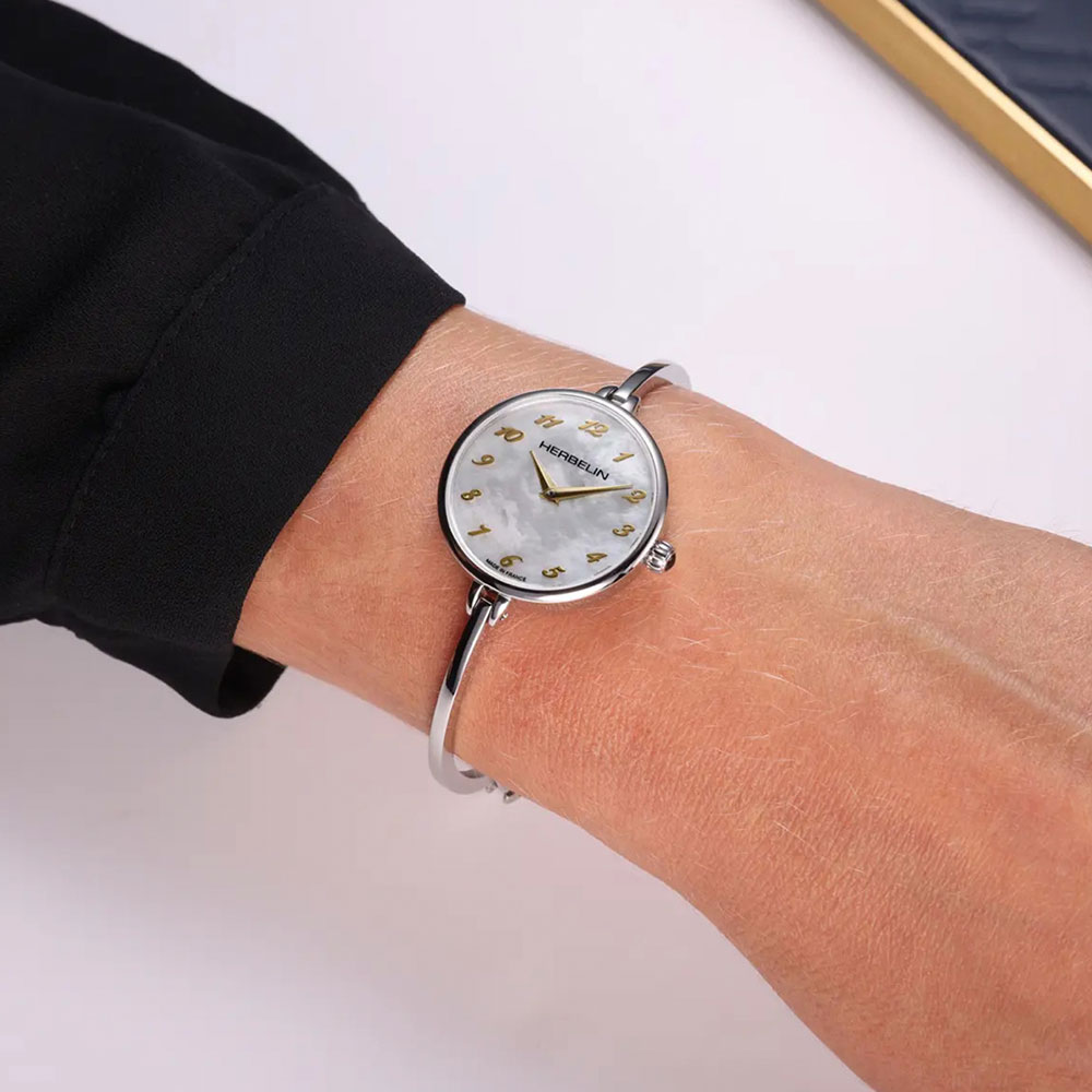 The HERBELIN Fil collection is designed with the attention to the smallest detail . Fil accompanies women who love subtly offbeat chique. The rigidity of the stainless steel bracelet coupled with the 26mm case accentuates a finesse that is refined and delicate. The clasp is a fold over link clasp that compliments the jewellery feel. The Mother of Pearl dial with gold arabic indices applied every quarter is protected by sapphire crystal, has an understated elegance. A true design that is inspired by the past, however adapted to current design technologies.