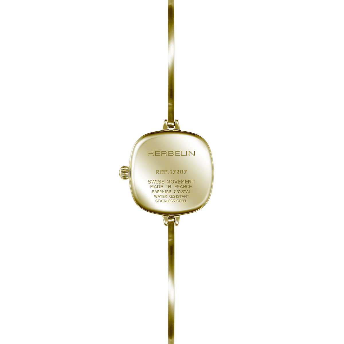 The HERBELIN Fil collection is designed with the attention to the smallest detail . Fil accompanies women who love subtly offbeat chique. The rigidity of the stainless steel bracelet with gold PVD plate coupled with the soft square 24 x 24 mm case accentuates a finesse that is refined and delicate. The clasp is a fold over link clasp that compliments the jewellery feel. The stark black dial with indices applied every quarter is protected by sapphire crystal has an understated elegance. A true design that is inspired by the past, however adapted to current design technologies.