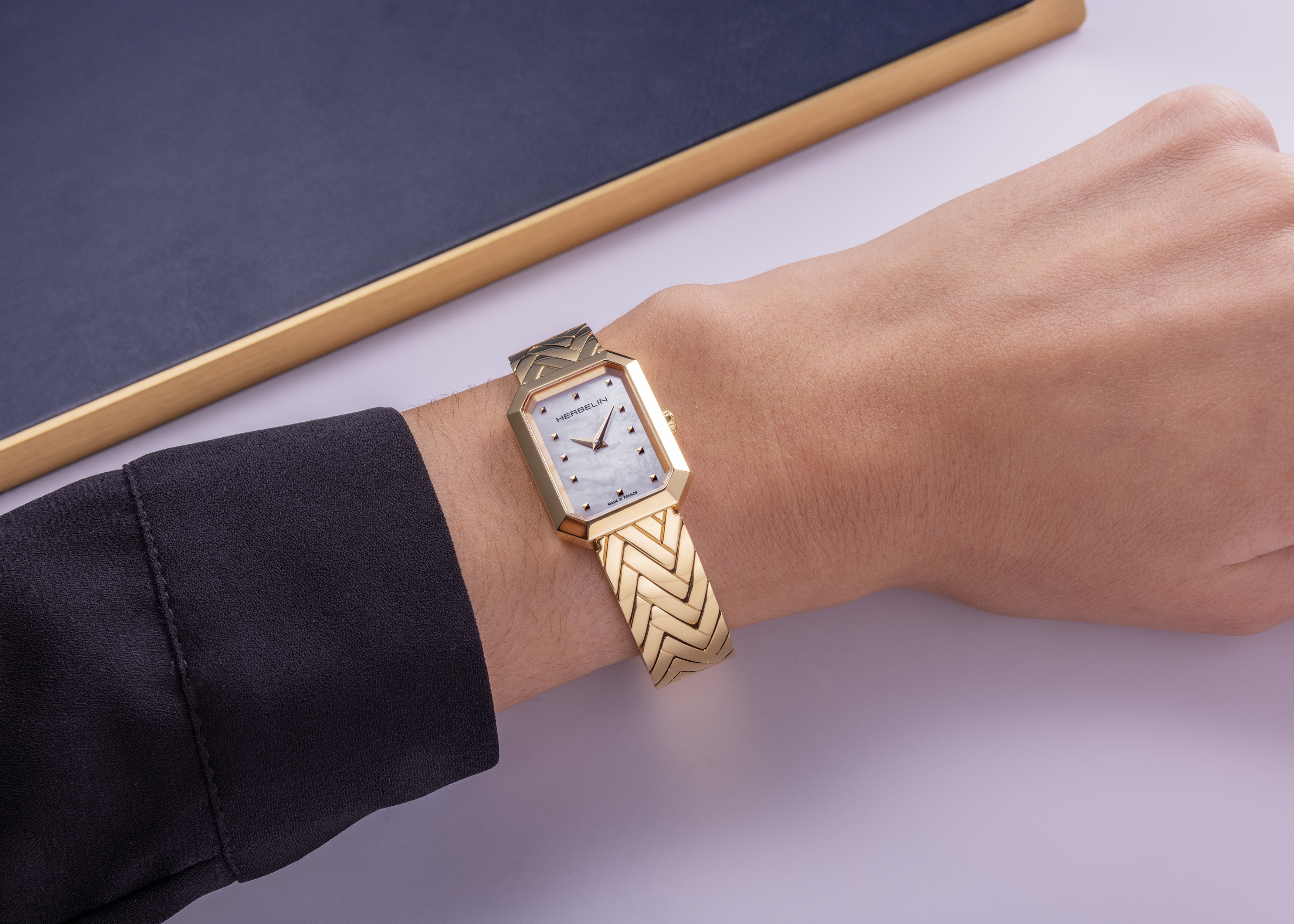 The OCTOGÔNE Rectangle Nacre Blanche watch embodies the pinnacle of feminine elegance in the world of fine watchmaking. This piece, which enriches the prestigious Octogône collection, is a true celebration of luxury and finesse. The case of this watch, in stainless steel coated with Yellow Gold PVD, displays a distinctive octagonal shape, reminiscent of an eight-sided diamond. The design of the watch, faceted and with cut sides, is both a tribute to the typical lines of the 50s and an affirmation of a glamorous neo-vintage aesthetic, while remaining anchored in modernity. The steel bracelet, also coated with Yellow Gold PVD, in chevron-style links, closes with a folding clasp, hugging the wrist with elegance and comfort. Equipped with a sapphire crystal and water-resistant to 50 meters, this creation promises exceptional durability. The OCTOGÔNE Rectangle Nacre Blanche watch is more than just a watch: it is a style statement, a watch jewel that radiates femininity. Perfect for today's woman, it is an essential accessory, with timeless chic, and which is suitable for any occasion.