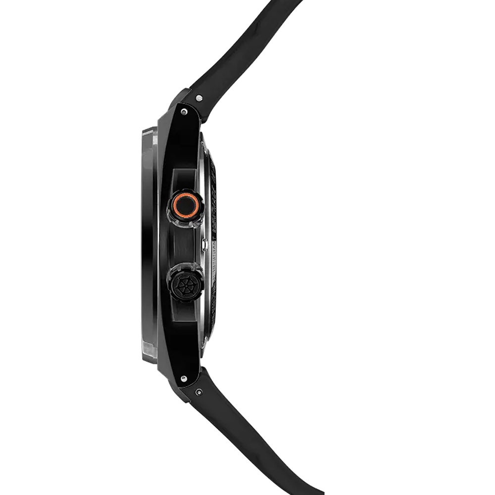 Immerse yourself in deep waters with the CAP CAMARAT Diver Automatique Noir watch, a harmonious blend of elegance and adventure. Perfect for underwater explorations and everyday urban activities, it combines neo-vintage design with exceptional performance. The 42 mm stainless steel case, with its DLC (Diamond Like Carbon) coating, offers unrivalled scratch resistance. Its rugged yet contemporary look is enhanced by its geometric, faceted shape, sublimated by a polished and brushed finish. The fixed bezel, embellished by six decorative screws aligned with the indexes, softens the design while adding a subtle touch of elegance. Technically sophisticated, this watch is designed for demanding divers. The bi-directional internal diver's horn, adjustable via a screw-down crown, features a luminescent indicator for precise tracking of dive time. The first 15 minutes are accentuated by a bright orange line, guaranteeing optimum legibility. Screwed crowns guarantee water resistance to 200 meters, eliminating any risk of malfunction due to flipper damage. The luminescent hands and hour markers guarantee impeccable visibility in the darkness of the deep sea. The bright orange second hand, in constant motion, confirms the watch's smooth running. The black FKM elastomer strap comes with a 10-year warranty and offers unrivalled comfort and flexibility. Ergonomically designed and equipped with a traditional buckle, it can be worn with a wetsuit as well as with streetwear. The watch case and movement are guaranteed for 3 years. Fusing watchmaking tradition with innovation, the CAP CAMARAT Diver Automatique Noir is the ideal watch for modern adventurers and diving enthusiasts.