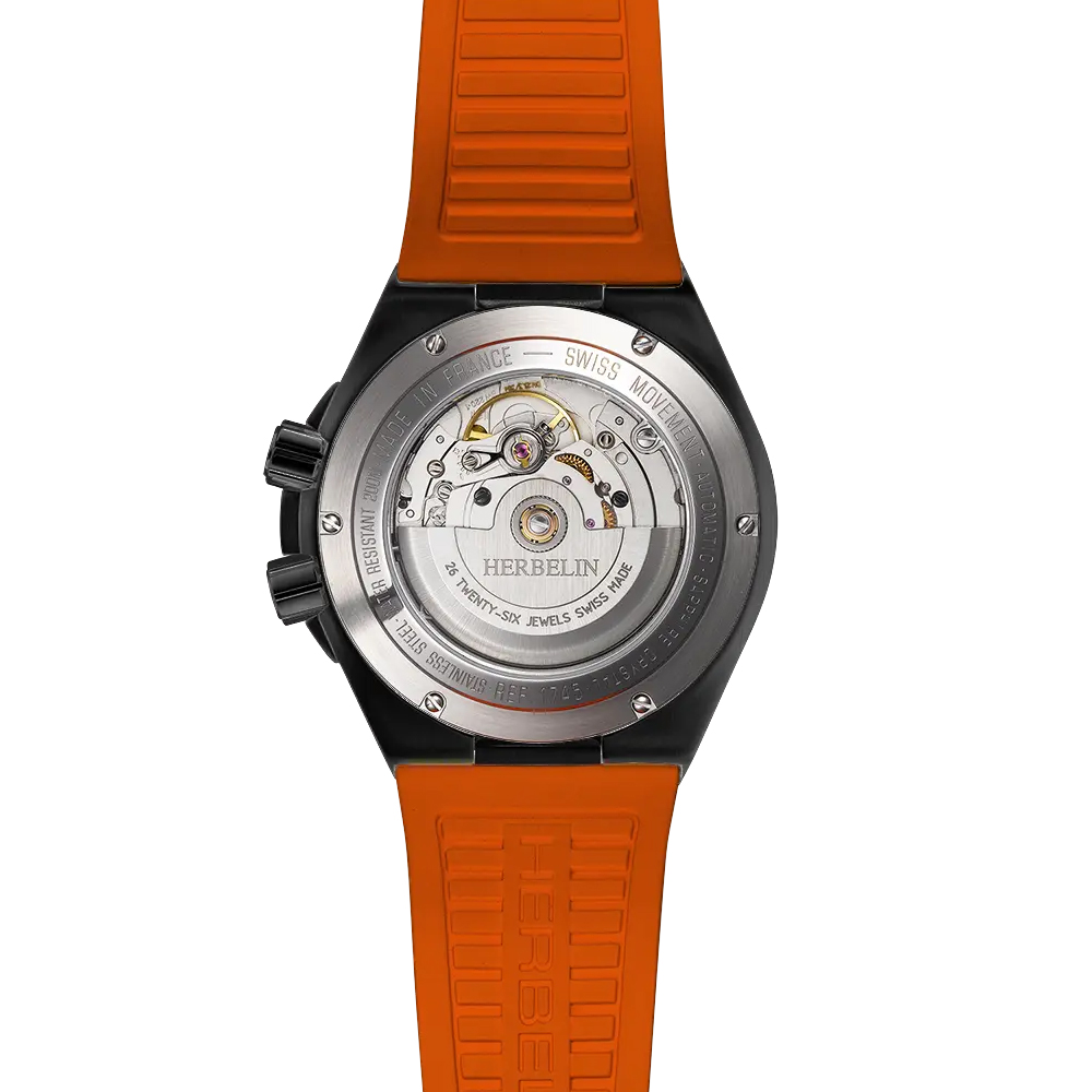 Take the plunge into marine exploration with the CAP CAMARAT Diver Automatique watch: a model that combines elegance and adventure. Inspired by HERBELIN's iconic watch designs of the 70s, this watch combines elegance and adventure. Ideal for underwater exploration and everyday city use, it combines neo-vintage design with outstanding performance. The 42 mm stainless steel case, with Diamond Like Carbon (DLC) coating, is exceptionally scratch-resistant. Its geometric, faceted design, enhanced by a brushed polished finish, lends a robust, modern aesthetic. The fixed bezel, adorned with six decorative screws aligned with the indexes, softens the design and adds a touch of understated elegance. This technically advanced watch offers many features for divers. The bi-directional rotating internal diving bezel, adjustable by means of a screw-down crown, features a luminescent indicator for easy calculation of dive time. The first 15 minutes are highlighted by a quarter-circle in vibrant orange for optimum legibility. Screwed crowns guarantee water resistance to 200 meters and prevent any malfunction caused by finning. Luminescent hands and hour markers ensure perfect visibility even in the darkness of the seabed. The continuously moving orange second hand also indicates that the watch is running smoothly. The FKM elastomer strap, with a 10-year warranty, is designed for maximum flexibility and comfort. Ergonomically designed with a traditional buckle, it fits perfectly over both wetsuits and streetwear. The watch case and movement are covered by a three-year warranty. Fusing watchmaking tradition and innovation, the CAP CAMARAT Diver Automatique is the perfect watch for modern adventurers and diving enthusiasts.