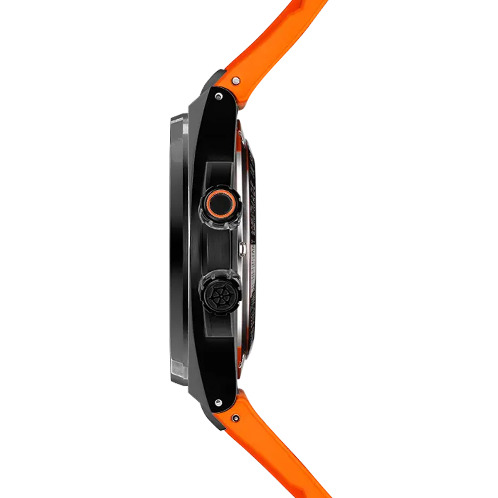 - Black French nautical horizontal pattern dial with bi-directional internal diver's horn, featuring a luminescent indicator, hand and hour markers. The"first 15 minutes" are accentuated by a bright orange line and a bright orange second hand.
