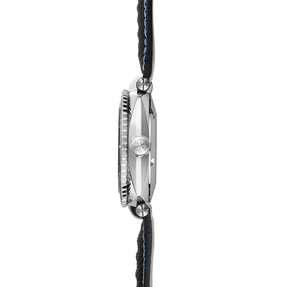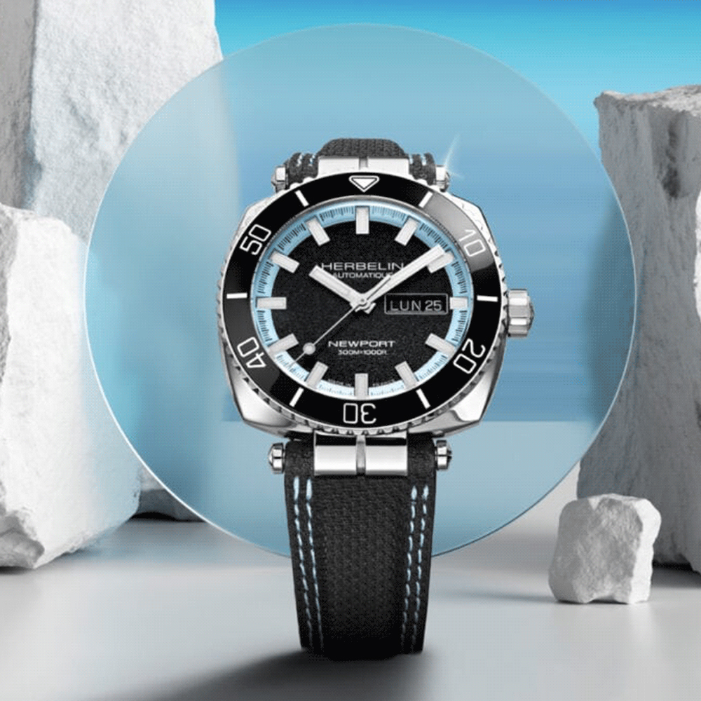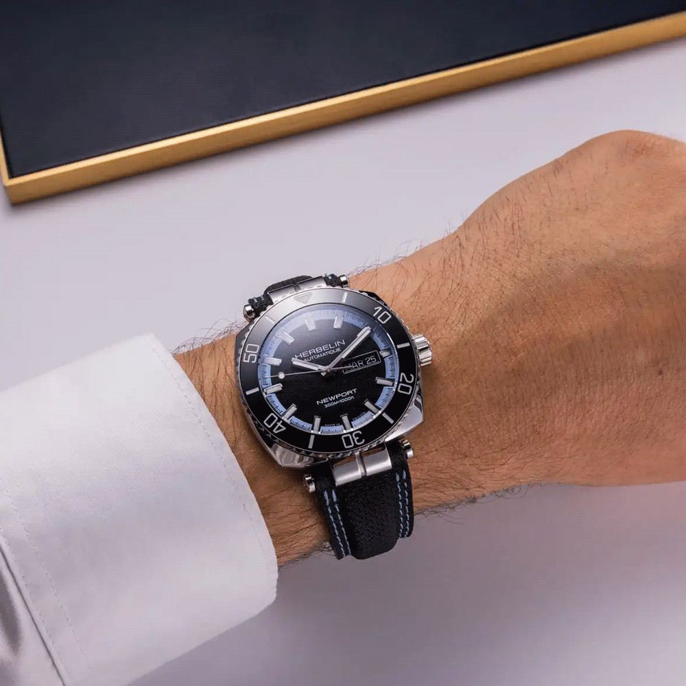 What if performance and elegance could coexist in the same diving watch? The NEWPORT Diver Automatic Blue Flange is the ultimate demonstration of this. Inspired by great maritime expeditions, it combines the refined allure of the NEWPORT collection with the demands of professional diving. Its 316L stainless steel case, screw-down crown, and engraved black ceramic bezel ensure optimal resistance up to 300 meters deep. The textured black dial, highlighted by a blue flange, enhances this model's unique character while ensuring perfect readability. Powered by a Swiss Sellita SW220 automatic movement, the NEWPORT Diver Automatic Blue Flange offers a 41-hour power reserve and reliable accuracy. The transparent case back reveals the mechanics in motion, adding a horological touch rarely seen in a diver's watch. The black textile strap, topstitched in blue, rot-proof, and water-resistant, conforms perfectly to the wrist thanks to its deployment buckle. Designed for adventure, crafted for everyday wear, this timepiece embodies our Maison's commitment to characterful watchmaking, blending technical mastery and assertive design.
