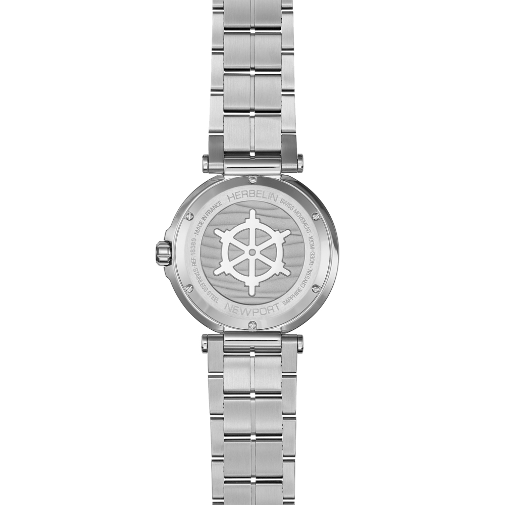 Sporty, elegant and unmistakably HERBELIN, this NEWPORT in stainless steel with a dark charcoal dial embodies pure elegance with sporty strength. The 40.5 mm case in satin-finished and polished stainless steel, enhanced by six decorative screws on the striking bezel, symbolizes the maritime heritage and modern spirit of the iconic Newport collection. The charcoal, finely textured dial with luminous indices and a date display at 3 o'clock ensures a clear, harmonious appearance and optimal legibility – day and night. Inside, the precise Swiss Ronda 6004.D quartz movement with a small seconds hand at 6 o'clock works reliably, accurately, and long-lastingly. Protected by an anti-reflective sapphire crystal and water-resistant to 100 meters, this watch combines robustness and performance at the highest level. The solid stainless steel bracelet with folding clasp completes the design and underscores its sporty yet elegant character—a Newport for all those who appreciate French design and technical perfection.