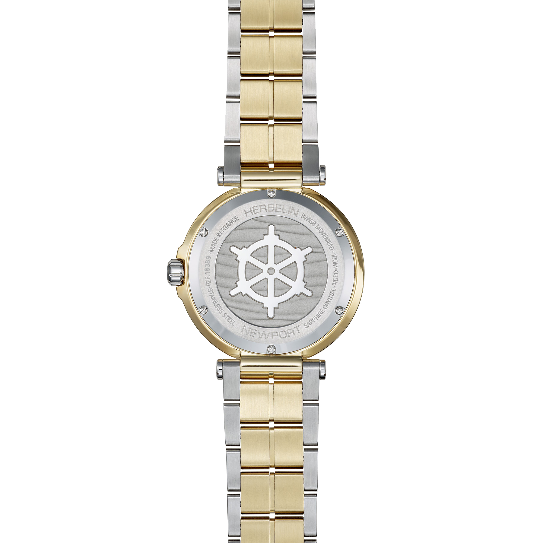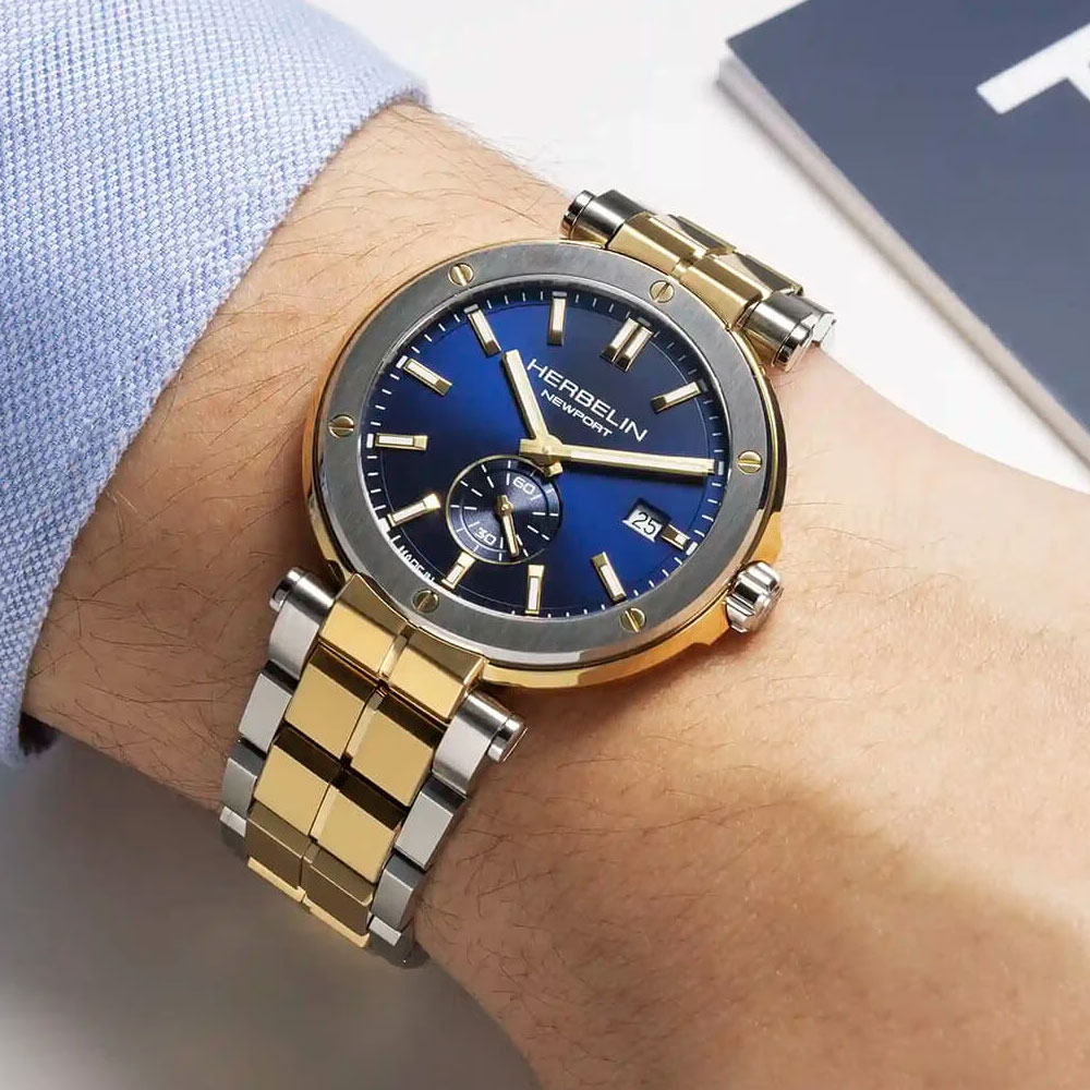 Sporty, elegant and unmistakably HERBELIN, this NEWPORT includes steel and PVD gold with a deep blue dial, impressively embodies HERBELIN's sporty yet elegant DNA. Its 40.5 mm case, crafted from premium 316L stainless steel and finished with a yellow gold PVD coating, forms a harmonious contrast with the deep blue dial. Six decorative screws on the iconic bezel underscore the unmistakable character of this collection. Inside, a precise Swiss Ronda 6004.D quartz movement with a small seconds subdial at 6 o'clock and a date display at 3 o'clock works – an expression of technical perfection and refined details. The anti-reflective sapphire crystal ensures optimal readability, as do the gold-coloured luminous hands and indices, while water resistance to 100 meters guarantees maximum suitability for everyday use. The stainless steel bracelet with gold PVD finishes completes the elegant overall look and emphasizes the luxurious, maritime sporty appearance. For over 30 years, the HERBELIN NEWPORT has stood for French savoir-faire and maritime spirit– a successful combination of precision, style, and timeless class.