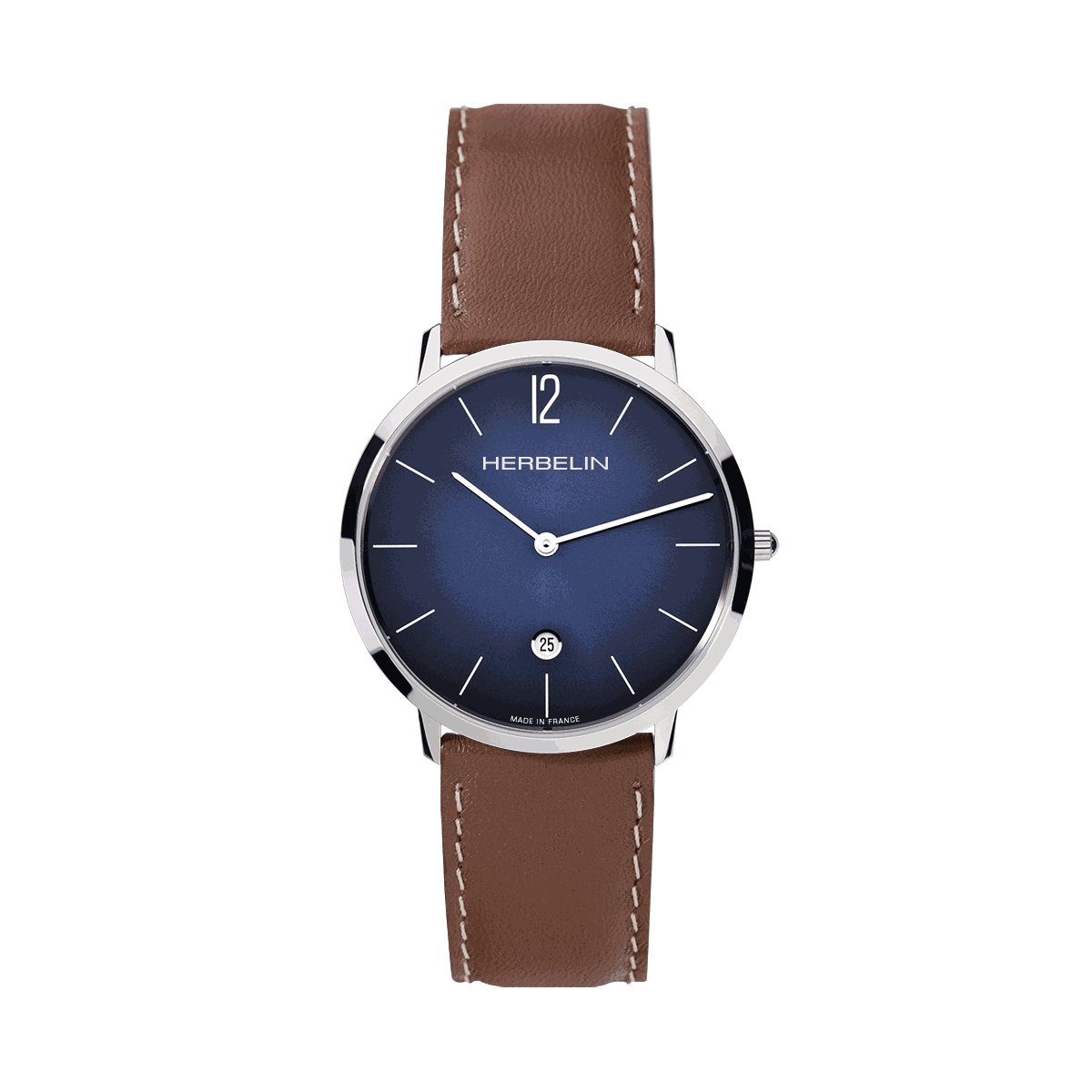 The Michel Herbelin City is designed for a city setting, casual and elegant. The Swiss quartz movement which is housed in a sleek 316L stainless steel case measuring 38.7mm, encasing a flat scratch resistant sapphire crystal glass, and featuring a sunray blue dial with applied silver stick indices . This timepiece is completed with a genuine leather tan strap and a tang buckle system. Epitomising true French elegance.an ambassador of Michel Herbelin mantra.