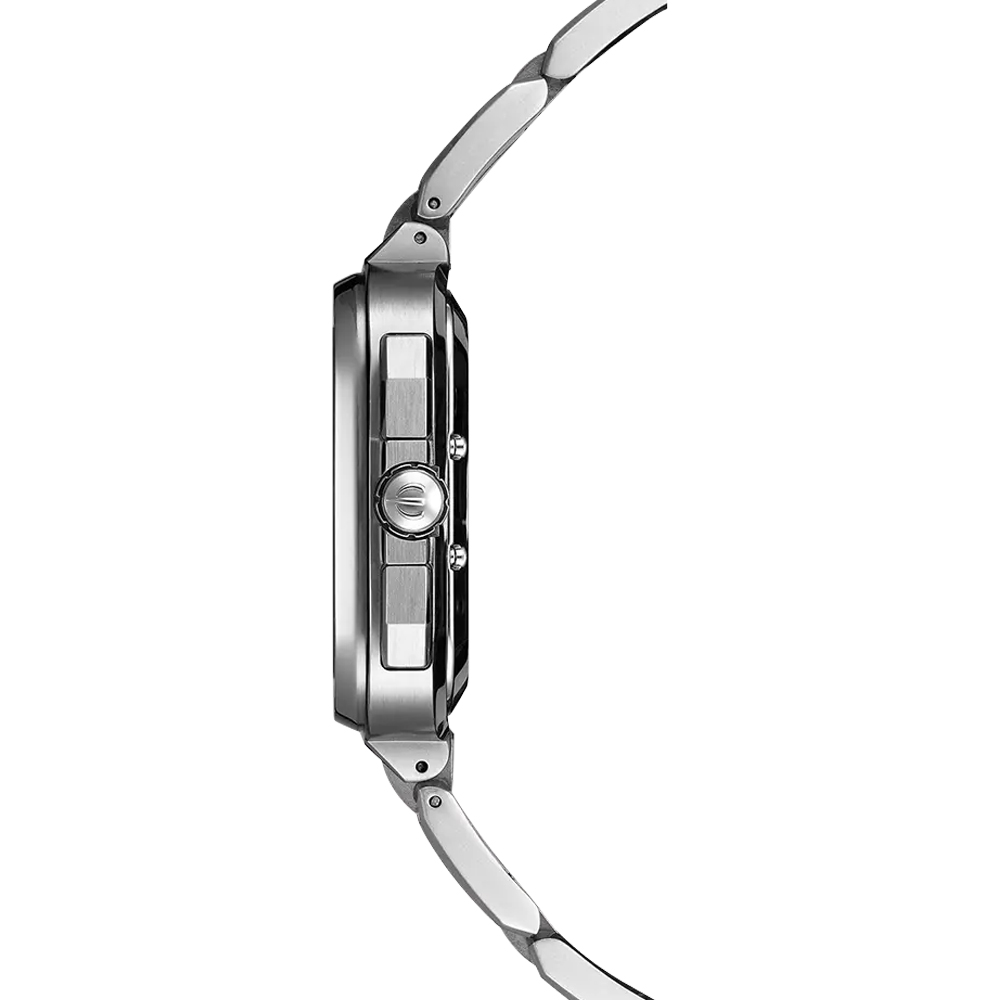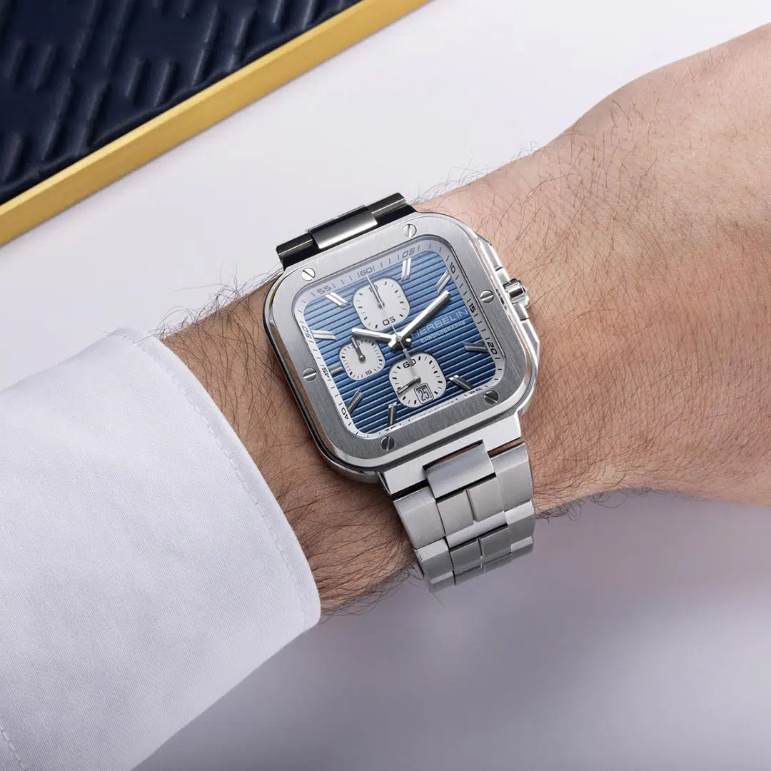 The CAP CAMARAT Square Chronographe Bleu is a men's model that combines sporty elegance and precision watchmaking. This model features a stainless steel case with a neo-vintage design, where robustness is accentuated by polished facets and a bezel adorned with six decorative screws aligned with the hour-markers. The notched crown attracts attention, while the push-buttons have been designed to blend harmoniously into the case. The intense blue dial, stamped horizontally, is punctuated by three C-shaped white counters and a date window at 6 o'clock. These counters display small seconds, 1/10th of a second and 30 minutes, thus integrating all the essential chronograph functions. The striking contrast between the white counters and the blue dial ensures excellent legibility. An elegant seconds hand adds an extra visual dimension to the whole. The steel link bracelet, designed for exceptional comfort and long life, is integrated into the case, amplifying the sporty-chic look of the watch. Equipped with a sapphire crystal and water-resistant to 100 meters, the CAP CAMARAT Square Chronographe Bleu runs on a SW200-1.11 ½''' quartz movement, guaranteeing high reliability. This model is a must-have for refined watch lovers looking for a functional, masculine and urban watch.