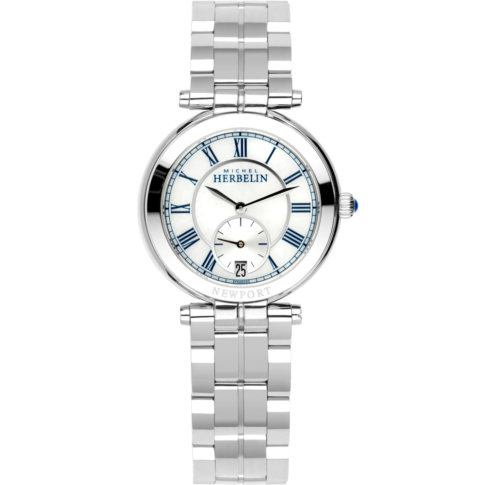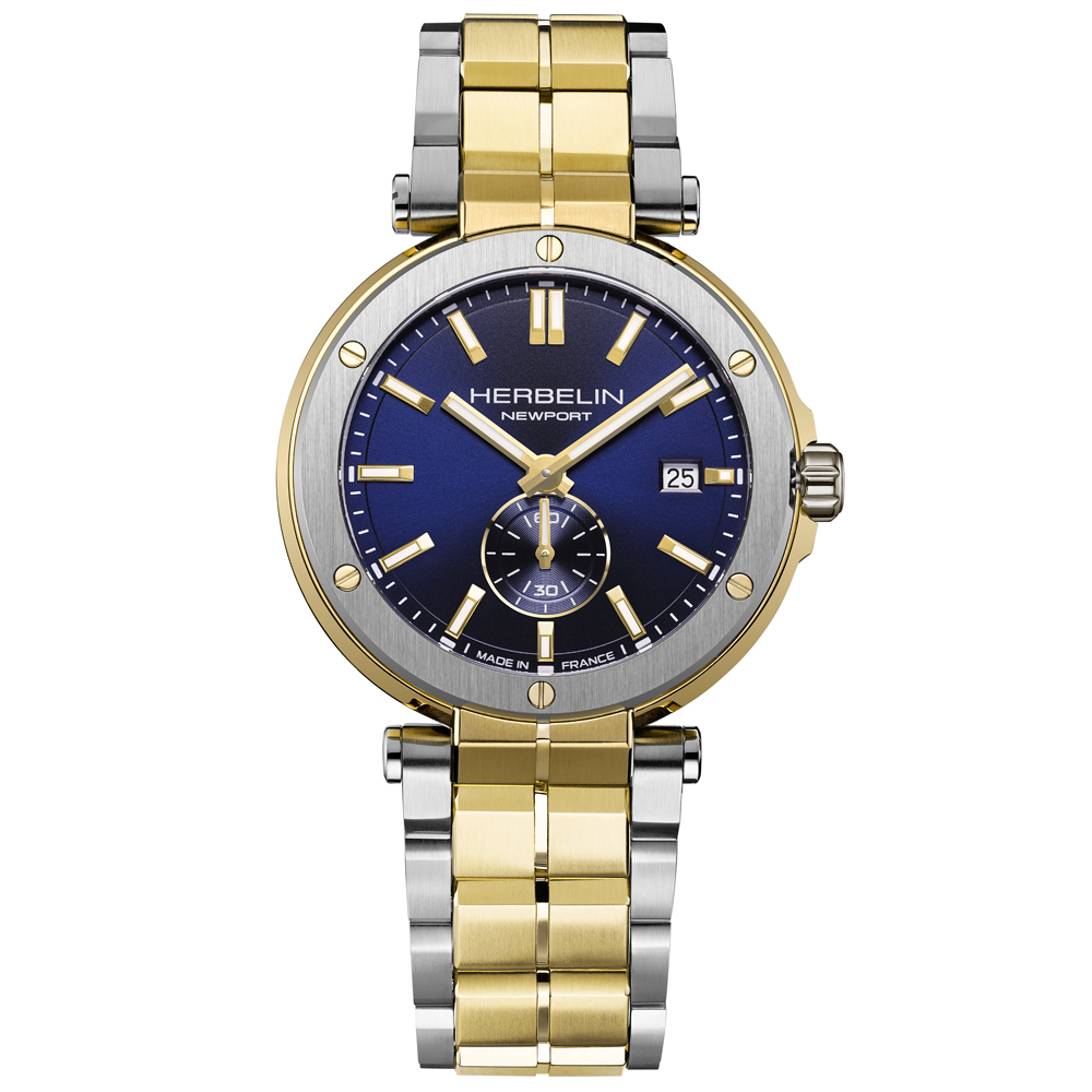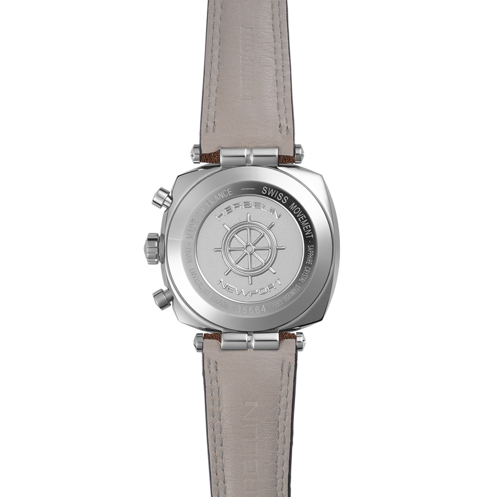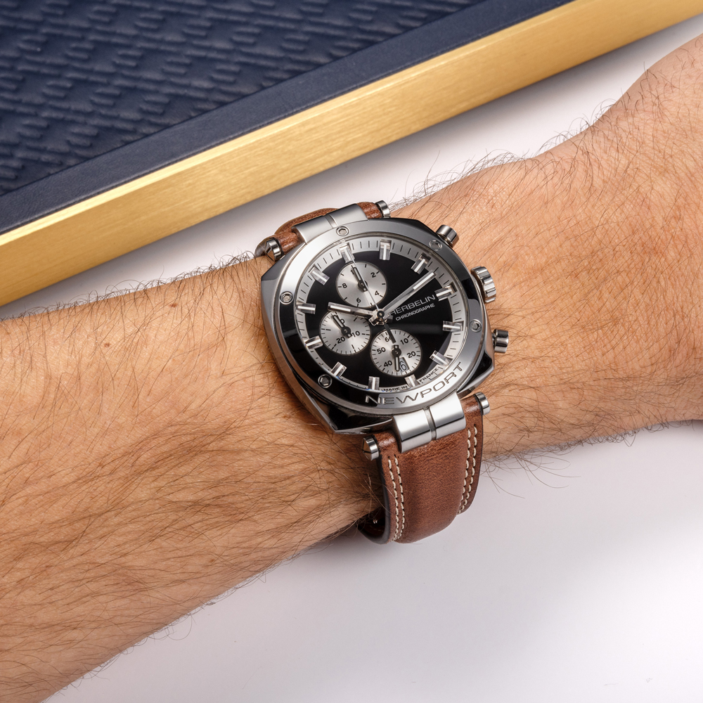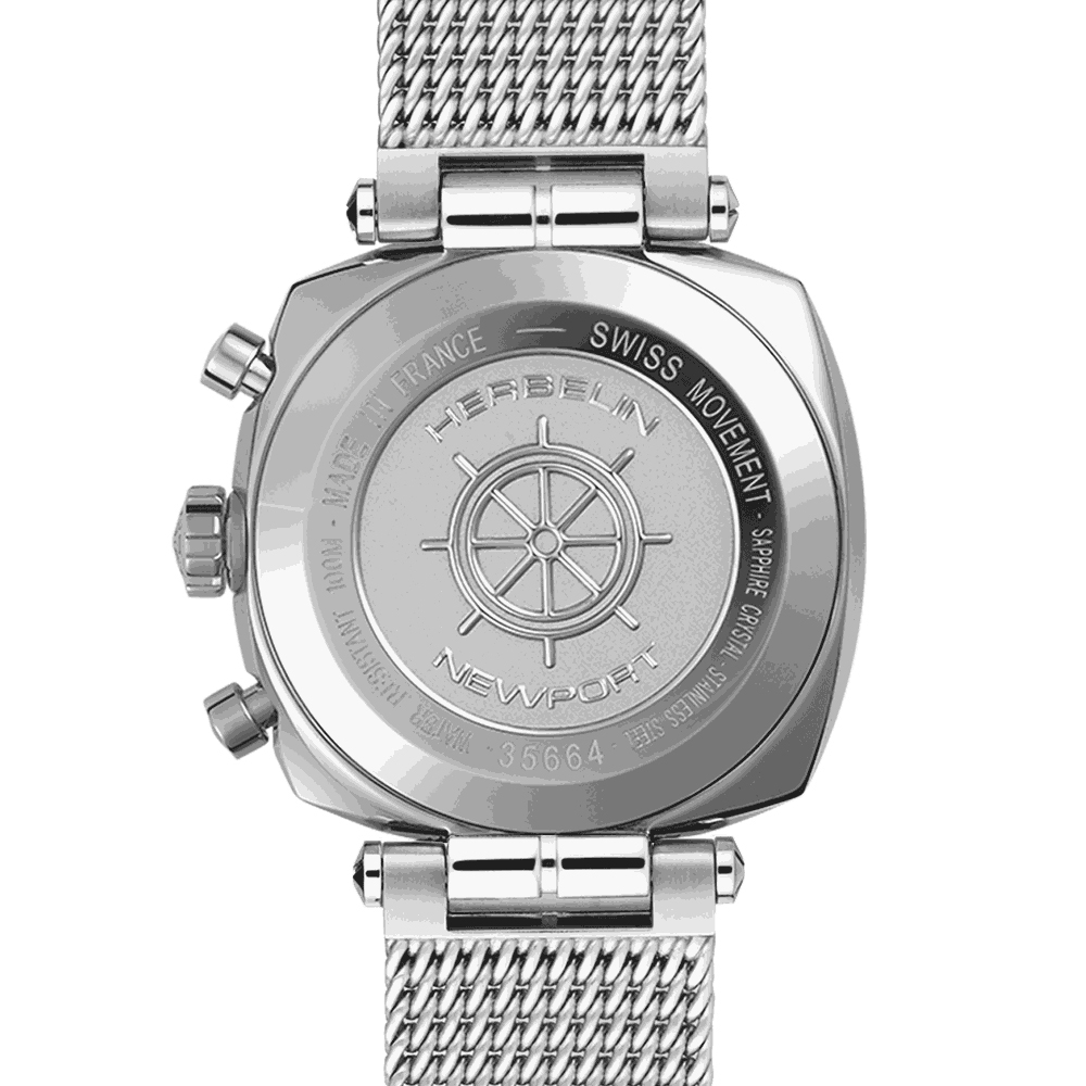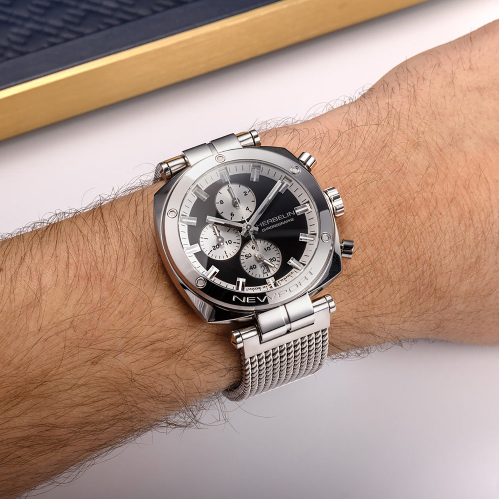 The Newport Héritage Chronograph from HERBELIN remains faithful to the Newport Héritage line. This chronograph adopts the characteristic watchmaking hallmarks of the 1970s, with its 42mm cushion shaped case in-vogue at the time. The Newport black sunray dial features 3 counters positioned in a C shape, protected by a double-sided domed sapphire crystal. This decidedly neo-vintage tri-compax chronograph is nevertheless clearly identifiable as a Newport with its nautical inspiration. The porthole-style bezel with its hexagonal socket-head screws is a strong reminder of this inspiration, as are the central lugs for the bracelet and the presence of an embossed steering wheel on the winding crown. Water-resistant to 100 metres, the Newport Héritage chronograph is paired with a bracelet that is made from strong 316L stainless steel satin mesh . A finely-tuned example of French Watchmaking