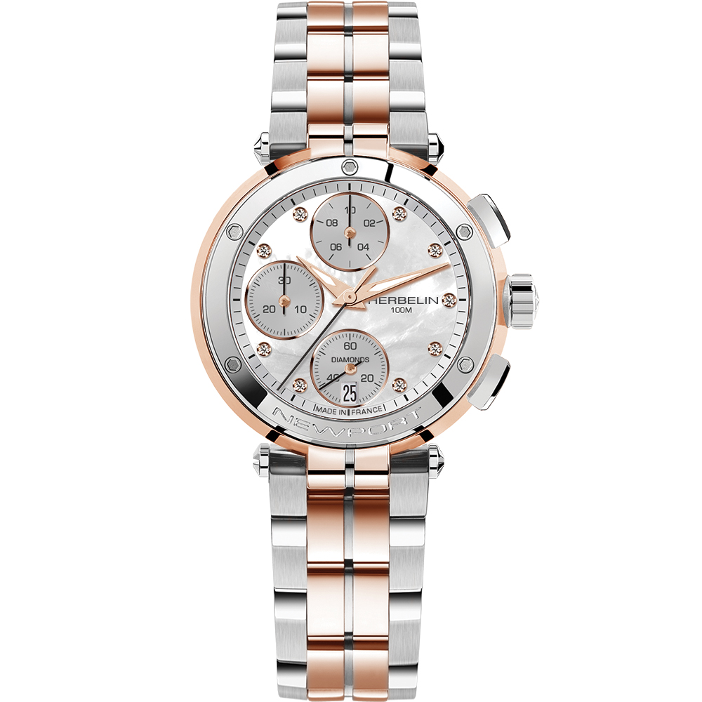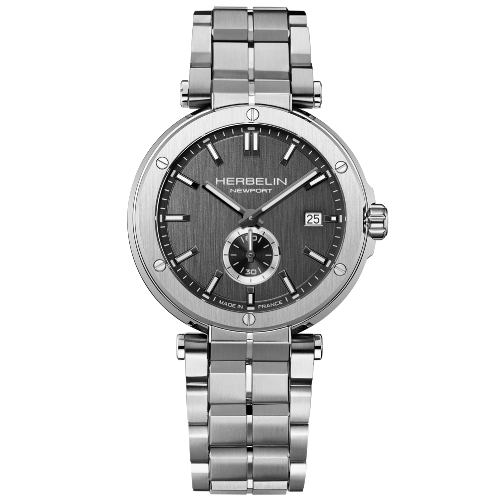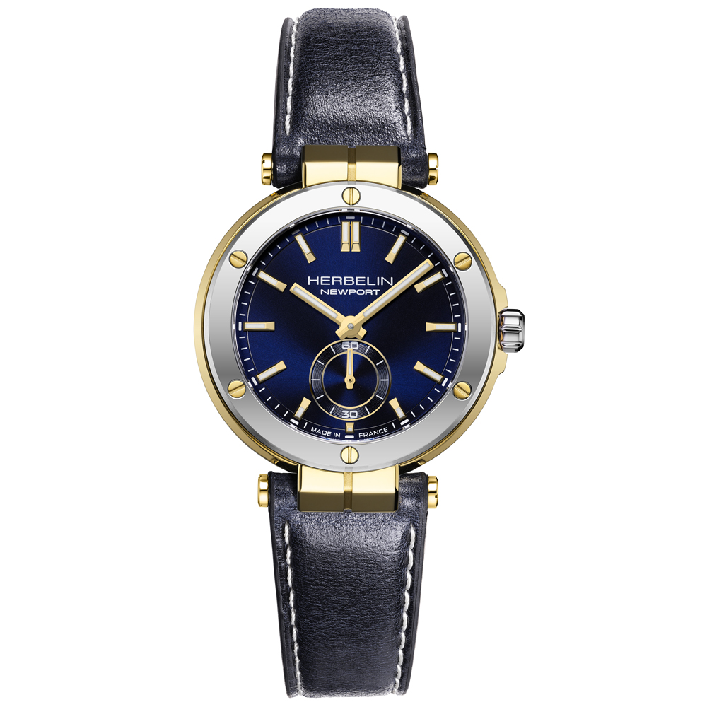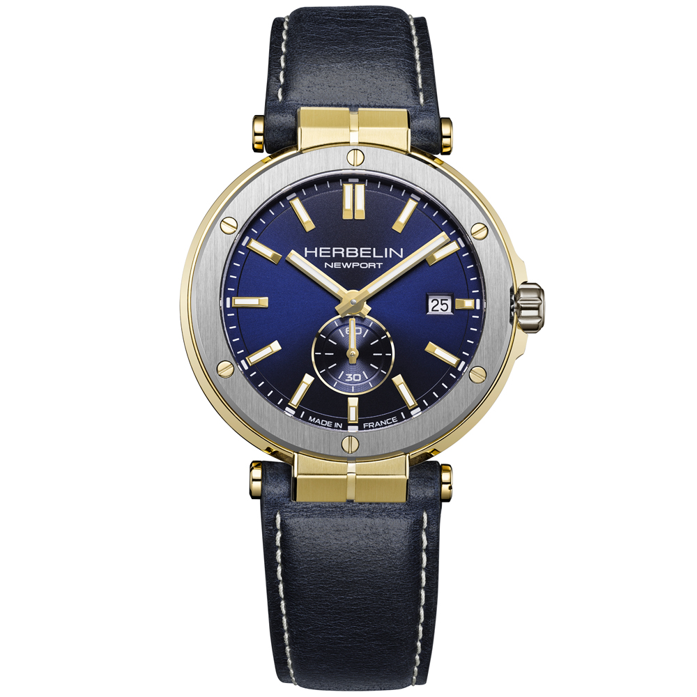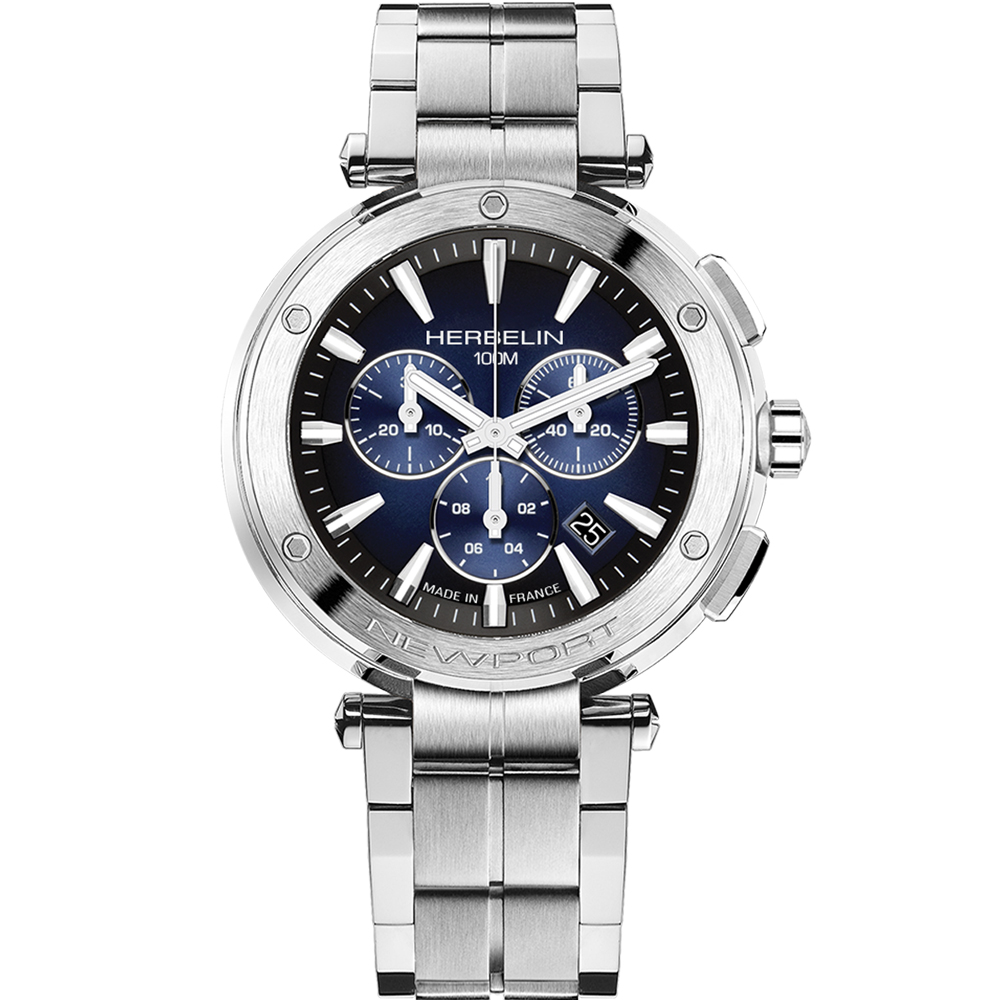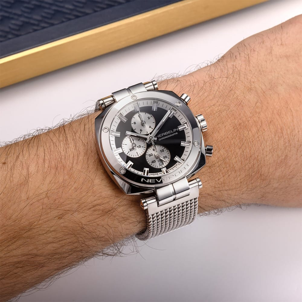 The Newport Héritage Chronograph from HERBELIN remains faithful to the Newport Héritage line. This chronograph adopts the characteristic watchmaking hallmarks of the 1970s, with its 42mm cushion shaped case in-vogue at the time. The Newport blue sunray dial features 3 counters positioned in a C shape, protected by a double-sided domed sapphire crystal. This decidedly neo-vintage tri-compax chronograph is nevertheless clearly identifiable as a Newport with its nautical inspiration. The porthole-style bezel with its hexagonal socket-head screws is a strong reminder of this inspiration, as are the central lugs for the bracelet and the presence of an embossed steering wheel on the winding crown. Water-resistant to 100 metres, the Newport Héritage chronograph is paired with a bracelet that is made from strong 316L stainless steel satin mesh . A finely-tuned example of French Watchmaking