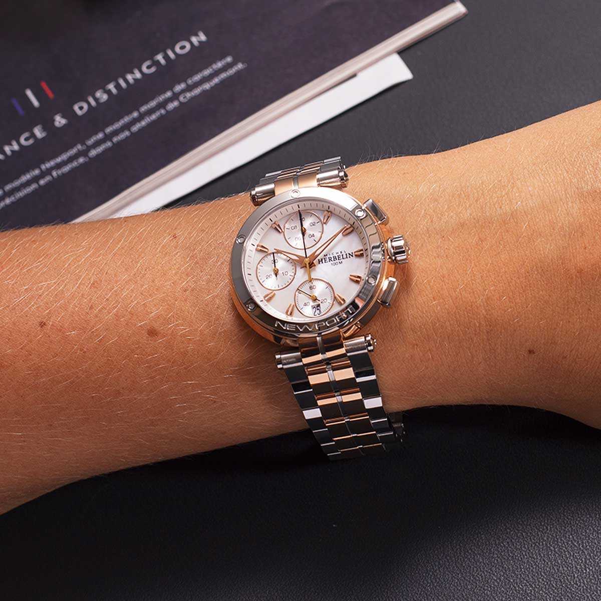 HERBELIN presents a ladies Newport Swiss Quartz Chronograph with diamonds in a steel and rose gold version. The sporty yet elegant watch makes it a choice timepiece for the active woman. Featuring a two tone 316L stainless steel with rose gold PVD link bracelet and a double folding clasp with a push piece opening mechanism that complements its sporty aesthetic. This 316L stainless steel and rose gold PVD case measuring 34mm, with a circular rose gold bezel which is engraved with a tachymeter scale, encasing flat scratch resistant sapphire crystal. The mother of pearl dial is punctuated with rose gold and diamond applied hour markers , which houses three counters in silver with rose gold accents . Water resistant to 100M.