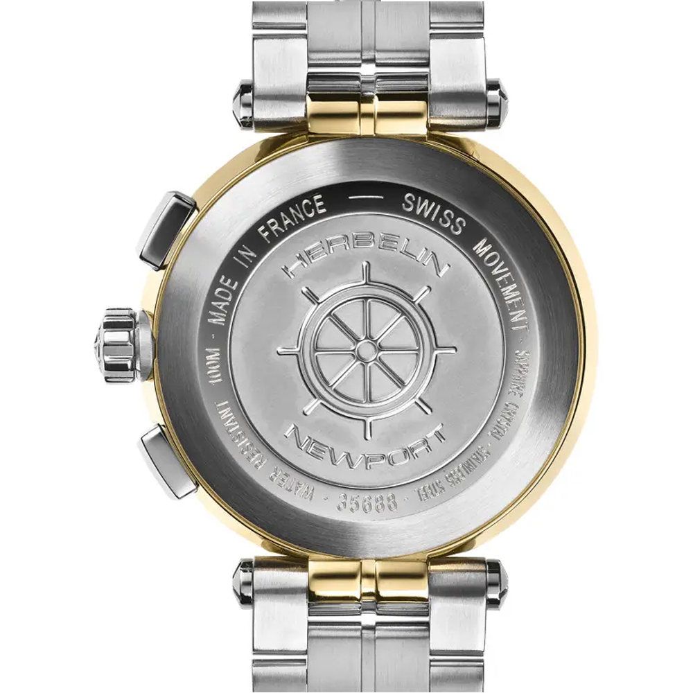 HERBELIN presents a ladies Newport Swiss Quartz Chronograph with diamonds in a steel and gold version. The sporty yet elegant watch makes it a choice timepiece for the active woman. Featuring a two tone 316L stainless steel with gold PVD link bracelet and a double folding clasp with a push piece opening mechanism that complements its sporty aesthetic. This 316L stainless steel and rose gold PVD case measuring 34mm, with a circular rose gold bezel which is engraved with a tachymeter scale, encasing flat scratch resistant sapphire crystal. The mother of pearl dial is punctuated with gold and diamond applied hour markers , which houses three counters in silver with rose gold accents . Water resistant to 100M.