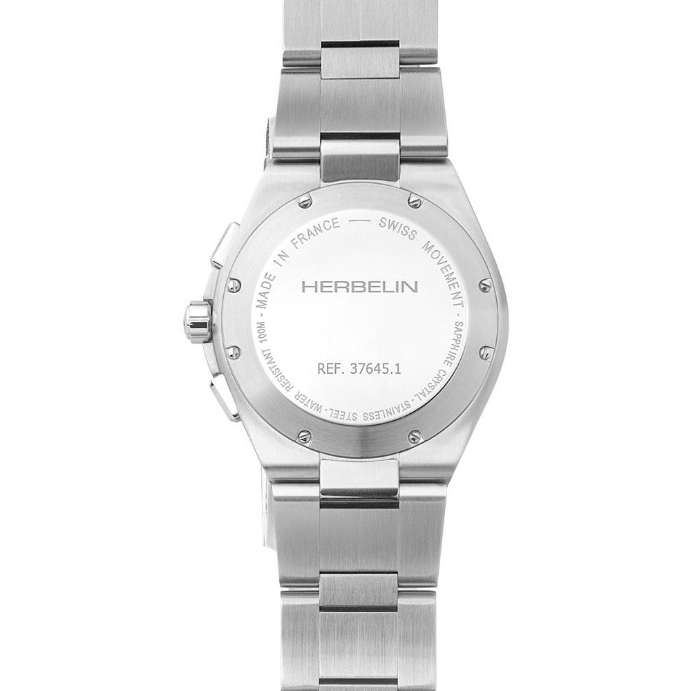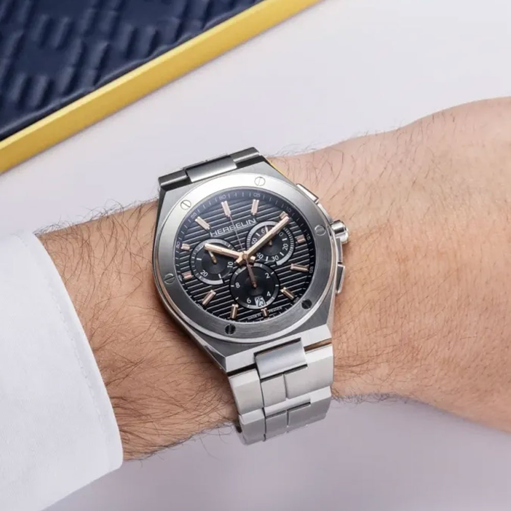 HERBELIN Cap Camarat , Inspired by the seventies, this design accentuates the elegance of its look with its pure sobriety. Manufactured with 316L stainless steel, the design exudes strength & depth with various finishes including highly polished and soft brushed features. The case measures 42 mm in diameter, including unique stainless steel brushed bezel set with six screws, encasing a flat scratch resistant sapphire crystal. The dial is decorated with rose gold indices and hands in contrast to the horizontally stamped black background with three counters. Heir to French watchmaking know-how, rooted in the Jura mountains in Franche-Comté since 1947, the Cap Camarat has been designed, assembled, adjusted and checked in the workshops of the Herbelin brand.