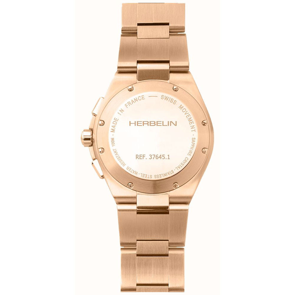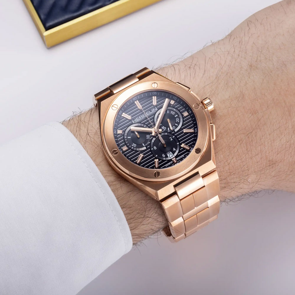 HERBELIN dresses its emblematic Cap Camarat model in rose gold. Inspired by the seventies, this design accentuates the elegance of its look with its pure sobriety. This model is fully coated with rose gold PVD, it has a strength and resistance to wear. The case measures 42mm in diameter with the bezel been given a brushed rose gold finish and draws the eye, through a play of contrasts, to the six decorative polished screws . The dial is decorated witrh rose gold indices and hands in contrast to the horizontally stamped black background with three counters. Heir to French watchmaking know-how, rooted in the Jura mountains in Franche-Comté since 1947, the Cap Camarat has been designed, assembled, adjusted and checked in the workshops of the Herbelin brand.