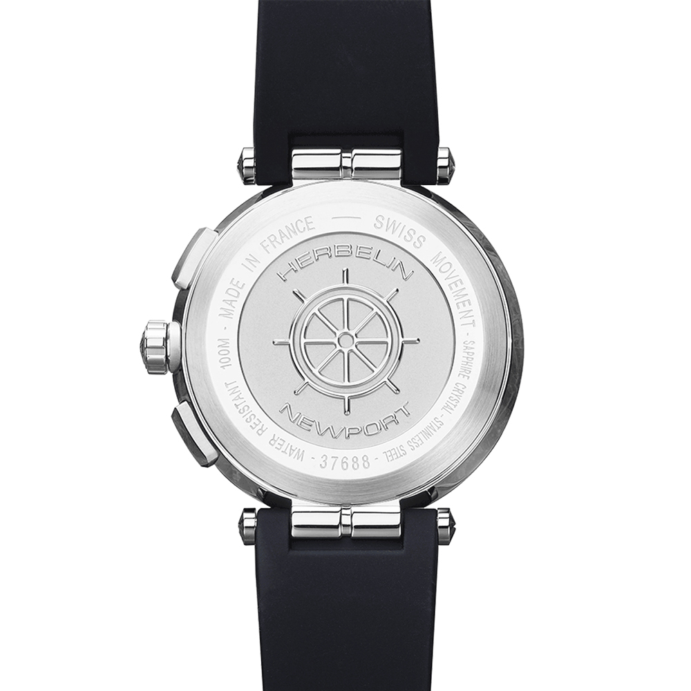 Michel Herbelin presents the streamlined Newport Swiss quartz chronograph in stainless steel with blue details. This sporty yet elegant watch makes it a choice timepiece. This Michel Herbelin comes with a blue FKM rubber strap and a double folding clasp with a push-piece opening mechanism that complements its sporty aesthetic. The Newport inspired 316L stainless steel case measures 43mm in diameter, with a circular brushed bezel encasing flat scratch-resistant sapphire crystal. The dark blue dial is punctuated with applied silver hour markers, which houses three counters with blue and silver accents. Water-resistant to 100m
