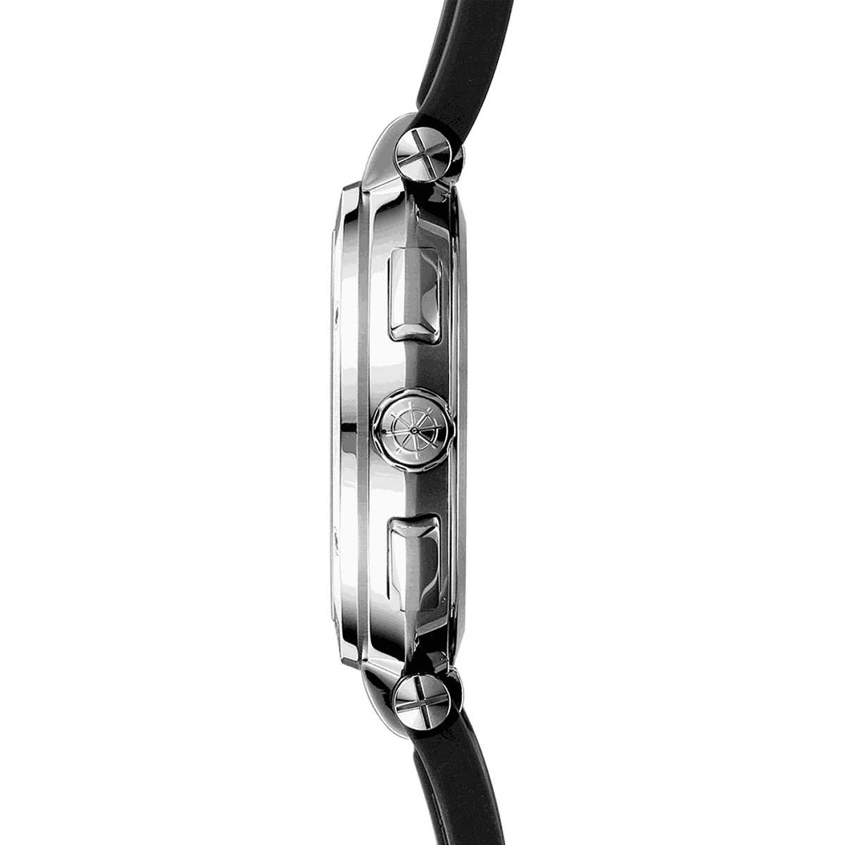- Dark blue dial and subdials with silver accents and applied silver indices