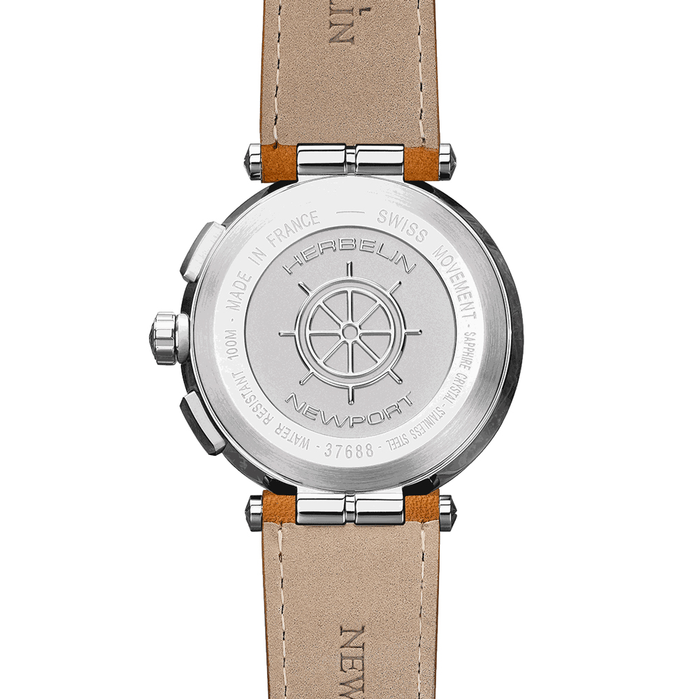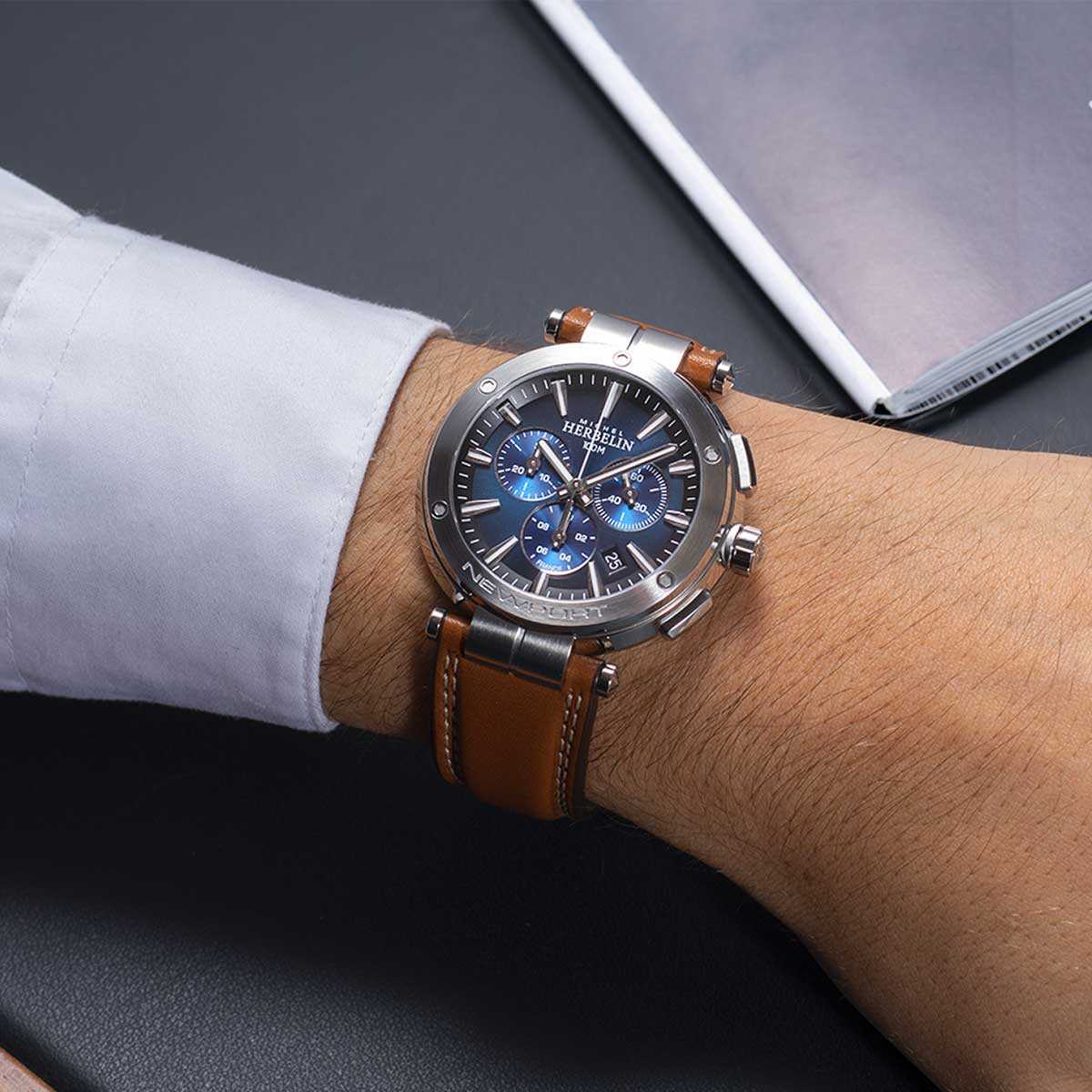 HERBELIN presents the streamlined Newport Swiss quartz chronograph with stainless steel, blue and tan details. This sporty yet elegant watch makes it a choice timepiece. This Michel Herbelin comes with a genuine leather tan stitched strap with a push-piece opening mechanism that complements its sporty aesthetic. This unique Newport inspired design 316L stainless steel case measures 43mm in diameter, with a circular brushed bezel encasing flat scratch-resistant sapphire crystal. The dark blue dial is punctuated with applied silver luminous hour markers, which houses three blue counters with silver accents. Water-resistant to 100m.