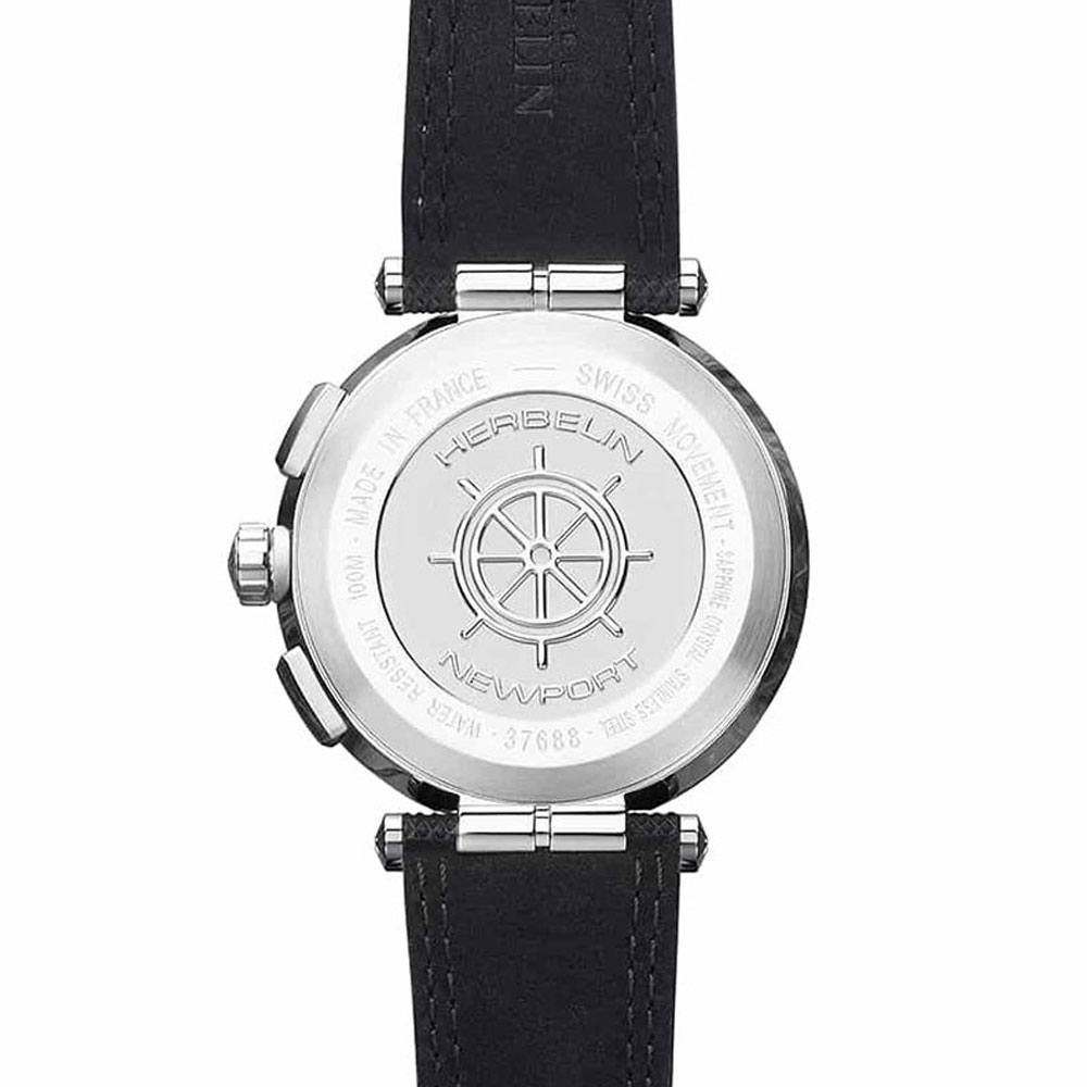 HERBELIN presents the streamlined Newport Swiss quartz chronograph with gunmetal grey, black and fine red details. This sporty yet elegant watch makes it a choice timepiece. This Michel Herbelin comes with a genuine leather red stitched strap with a black rubber overlay and a double folding clasp with a push-piece opening mechanism that complements its sporty aesthetic. This unique Newport inspired design 316L stainless steel case measures 43mm in diameter, with a black PVD circular brushed bezel encasing flat scratch-resistant sapphire crystal. The black dial is punctuated with applied silver hour markers, which houses three counters with black and red accents. Water-resistant to 100m.