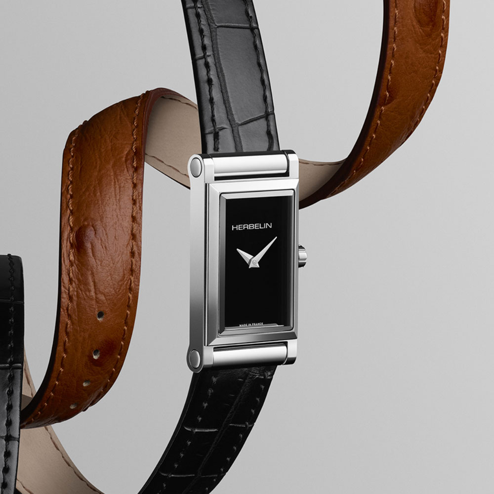 This Antares slim rectangular case encloses a black dial, which brings a touch of elegance and refinement to the design. Match it with red, white or tan leather strap or a barcelet of your choice to allow you to change your style at any time. Antares with its patented interchangeable strap system, let your inspiration flow. Vary styles endlessly to express elegance and perfection, a unique combination just like you.