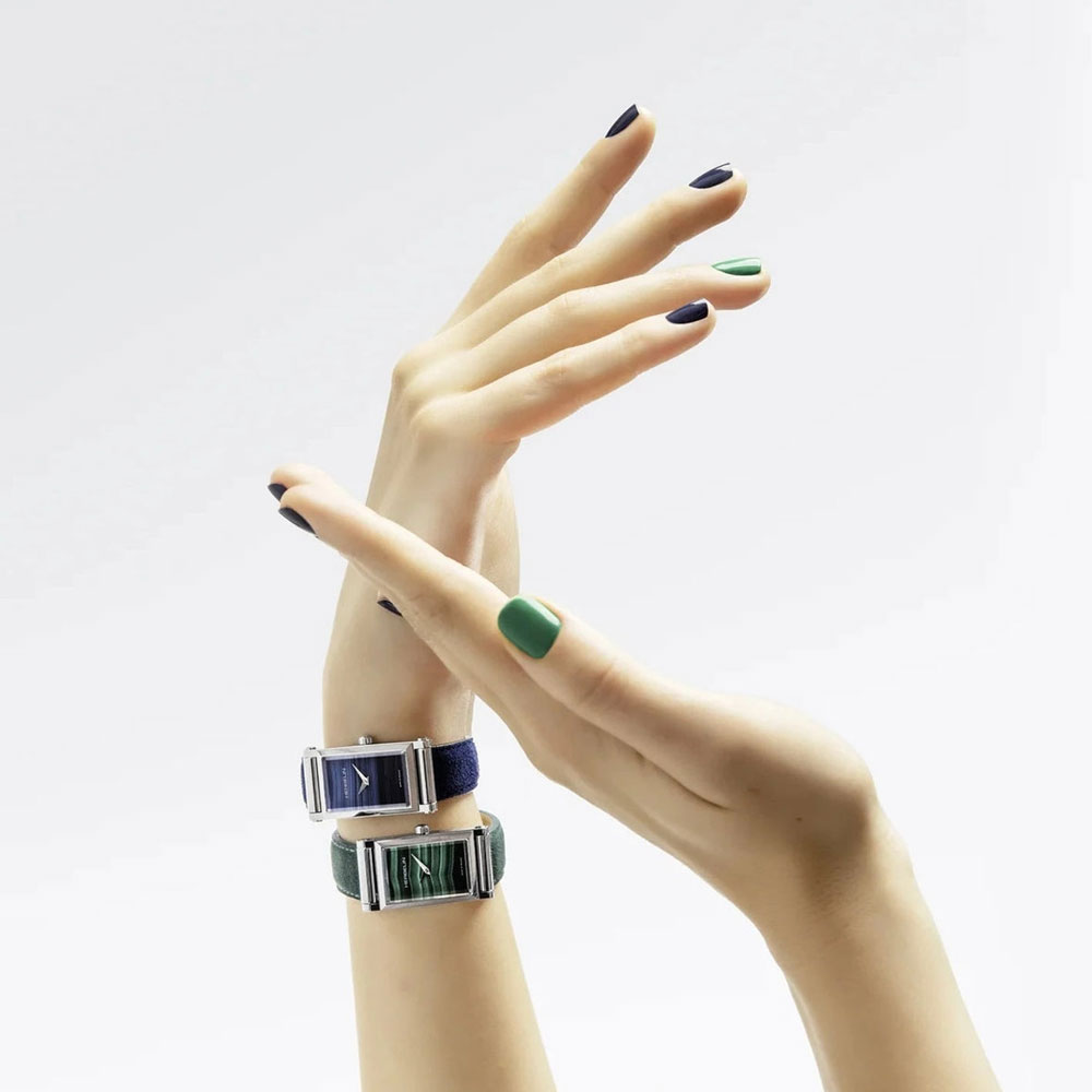 This Antares slim rectangular case encloses a beautiful dial made of blue Agate mineral stone, which brings a touch of elegance and refinement to the design. Match it with a navy blue leather strap or a barcelet of your choice to allow you to change your style at any time.